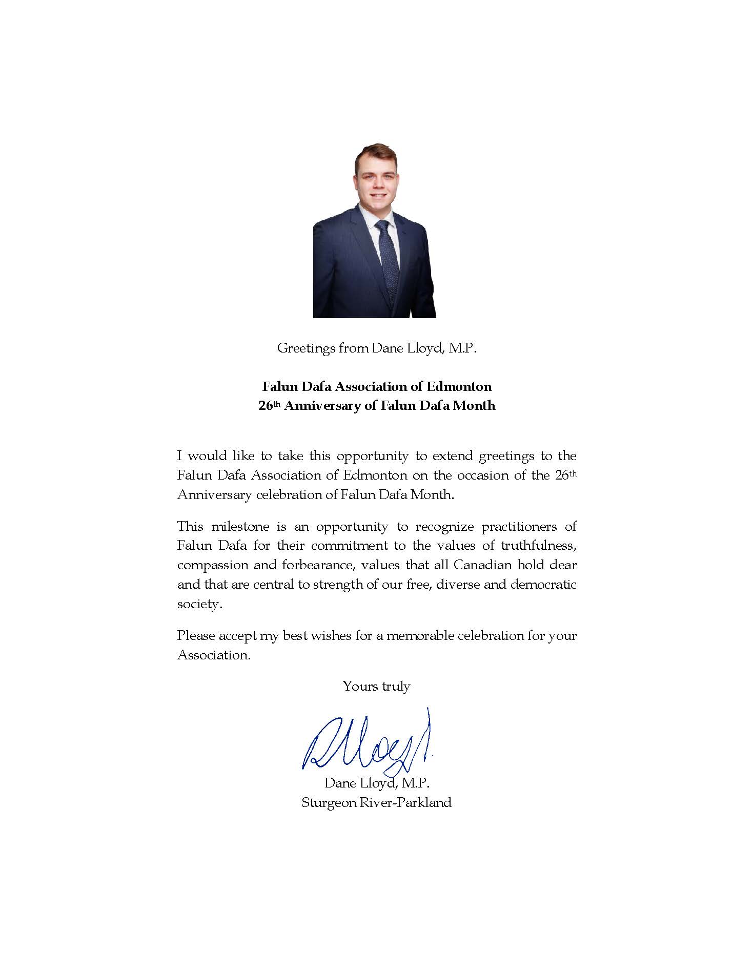 Parkland-Sturgeon River选区国会议员Dane Lloyd在贺信中表示:“值此法轮大法日之际,我向埃德蒙顿法轮大法学会致以节日的祝贺。