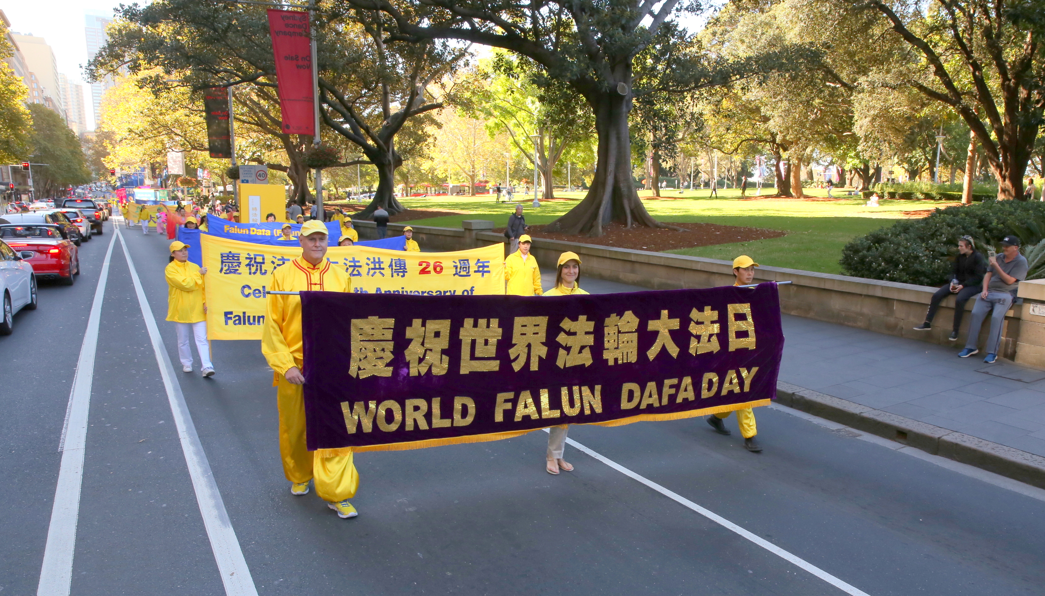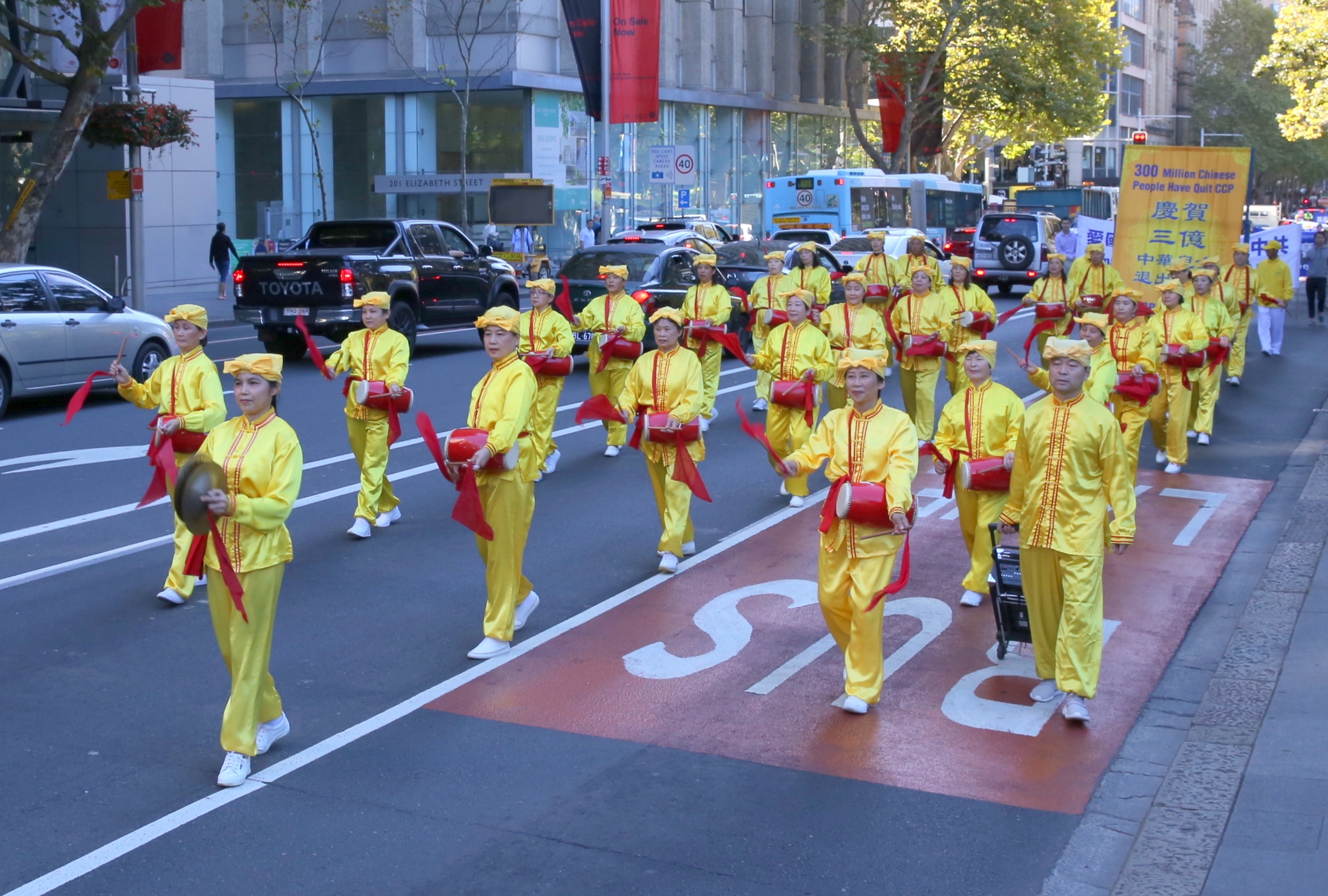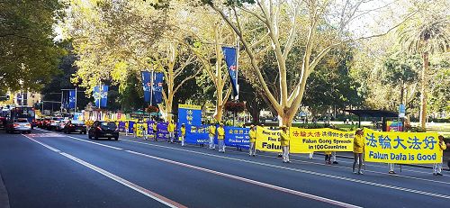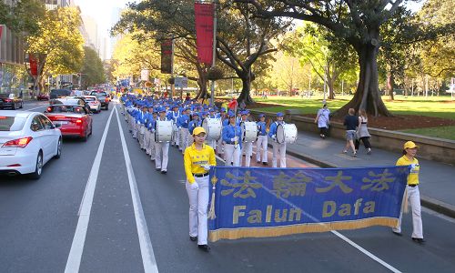 中午时分,法轮功学员的盛大游行队伍由天国乐团领队、声势浩荡地从悉尼马丁广场(Martin Place)前出发,沿悉尼商业主街游行至贝尔莫公园(Belmore Park)。沿途悉尼各界民众被祥和、亮丽又壮观的游行队伍震撼和吸引,纷纷驻足观看、拍摄留念并用社交媒体传播、分享至世界各地。