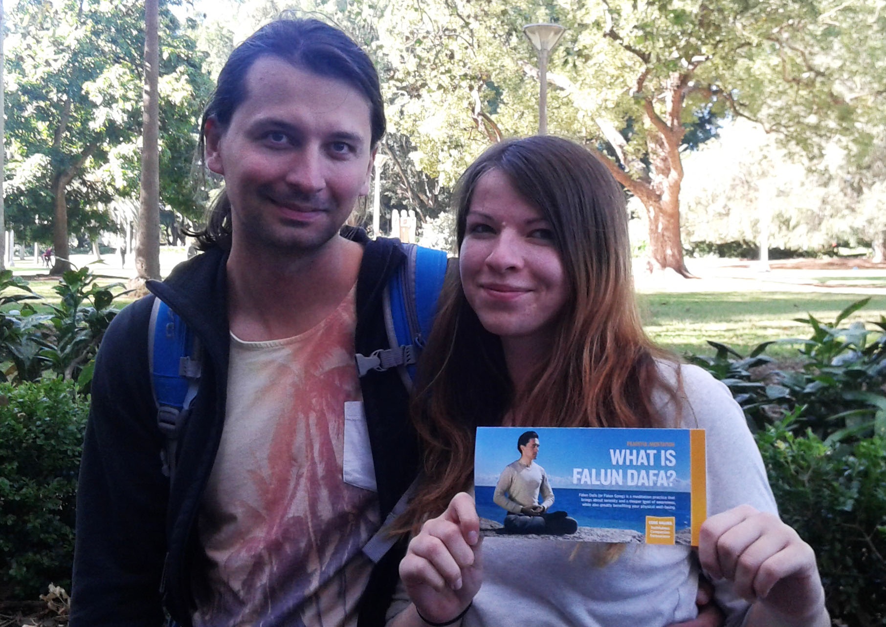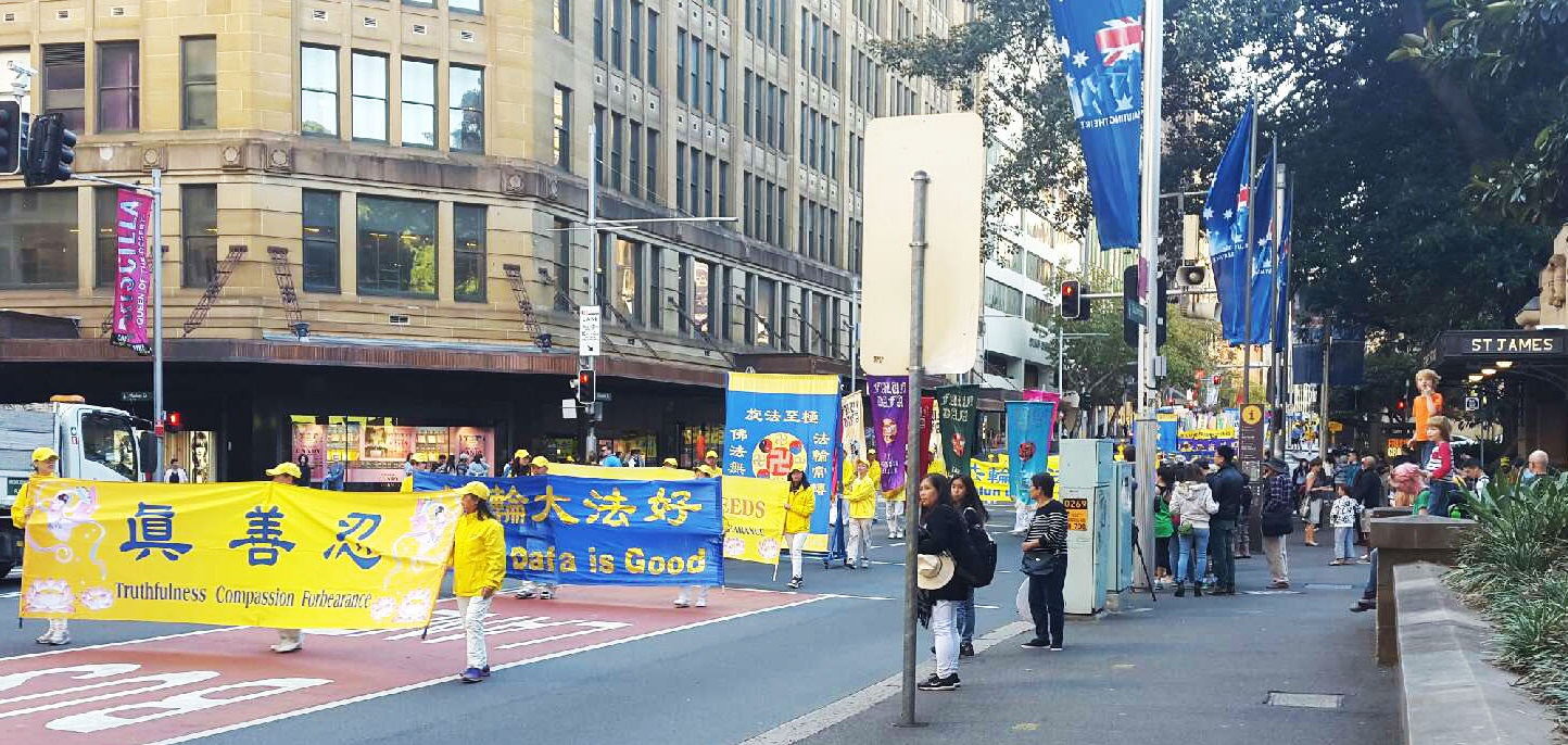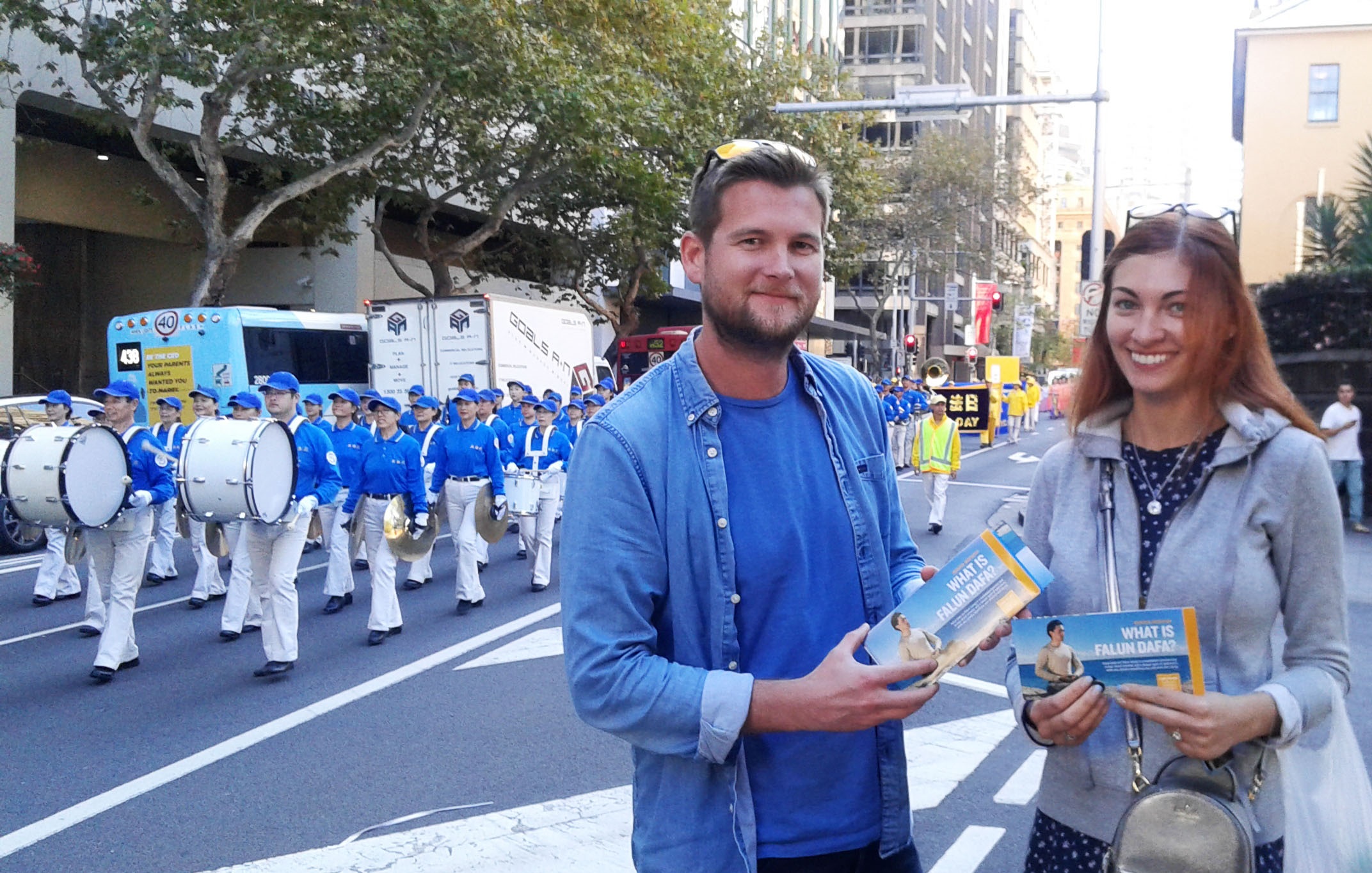 一对从中国来悉尼旅游的年轻华人看到游行后说:“我们在香港多次看到法轮功游行了,很壮观美好!但是这在国内是被禁止的,我们很想了解为什么法轮功会被如此迫害?”法轮功学员给他们详细解答并谈到中共如何把中华传统文化摧毁和阻断人与神佛的联系时,男青年点头说:“对,对,对,这个我明白,爱国不等于是爱党,现在的中国年轻人其实都有这种想法,不过在中国大家都只管做自己的事,不愿意去管国家大事,因为管了也没用……法轮功这么做真了不起!”