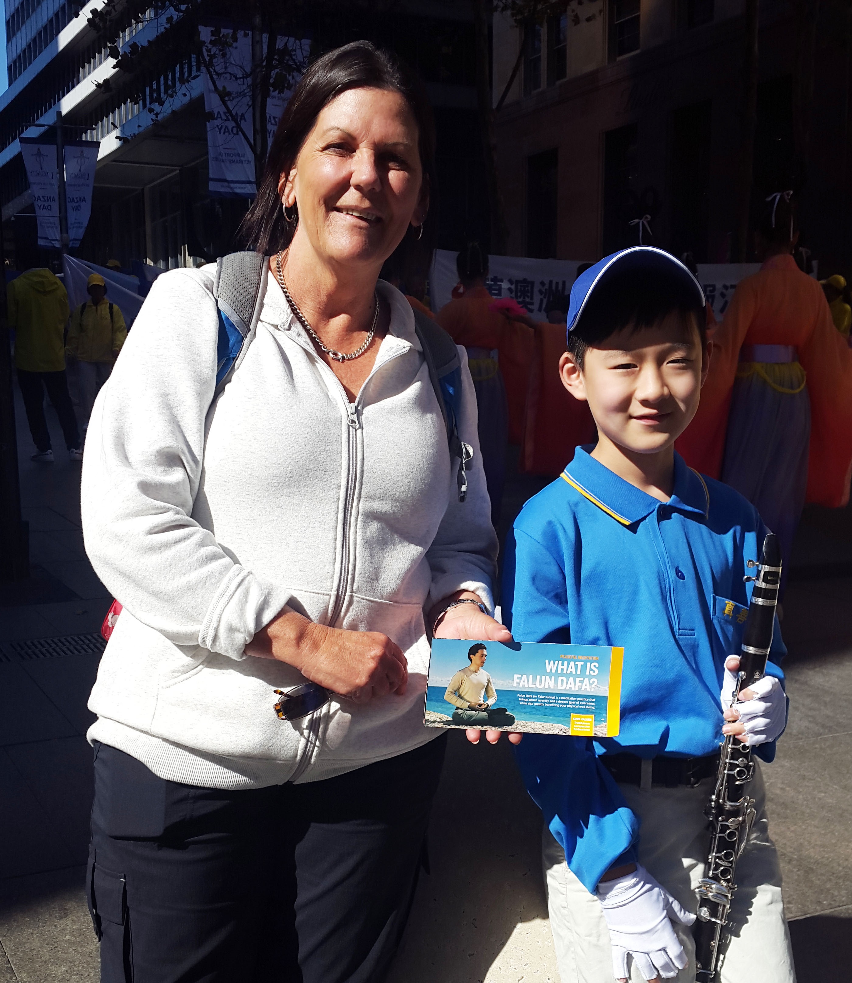 维姬女士(Vicky C)站在法轮功游行队伍前看了很久并和法轮功学员聊了很久,她表示:“今天通过和法轮功学员交谈了解到的真相,让我非常深入明白了很多、很深重的事情。中共给中国人民造成了很多灾难,中国人民仅仅是需要信仰和言论自由,而中共的迫害手段是非常邪恶和错误的。今天法轮功学员在这里为澳洲人民了解中共本质以至不被中共渗透和欺骗,做了那么卓越的努力和贡献,他们所展现的法轮大法的美好真是太好了!太好了!”