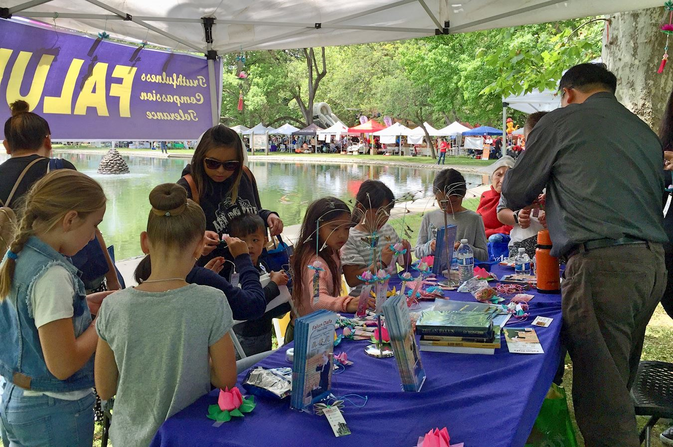 ![]() 图2:不少家长和小朋友来摊位学折纸莲花,学员一边教折纸莲花,一边给他们讲法轮功的故事。 |