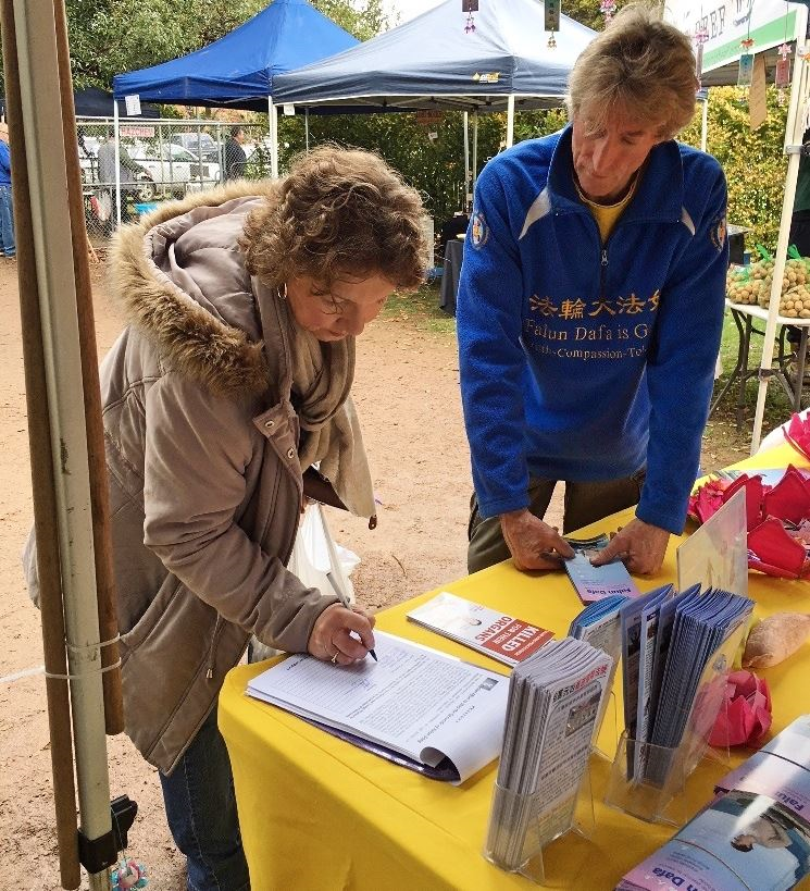 在Violet Town一家咖啡馆工作的安妮·米歇尔(Annie Mitchell ),在征签表上签字并和法轮功学员聊了许久之后,她希望学员们能在本地举行讲座或者教功班。临走时,她拿走一叠传单,打算给周围的亲朋好友们介绍,或者放在自己工作的咖啡店里。她表示,希望能吸引到足够的人数,这样就可以邀请学员来办教功班了。