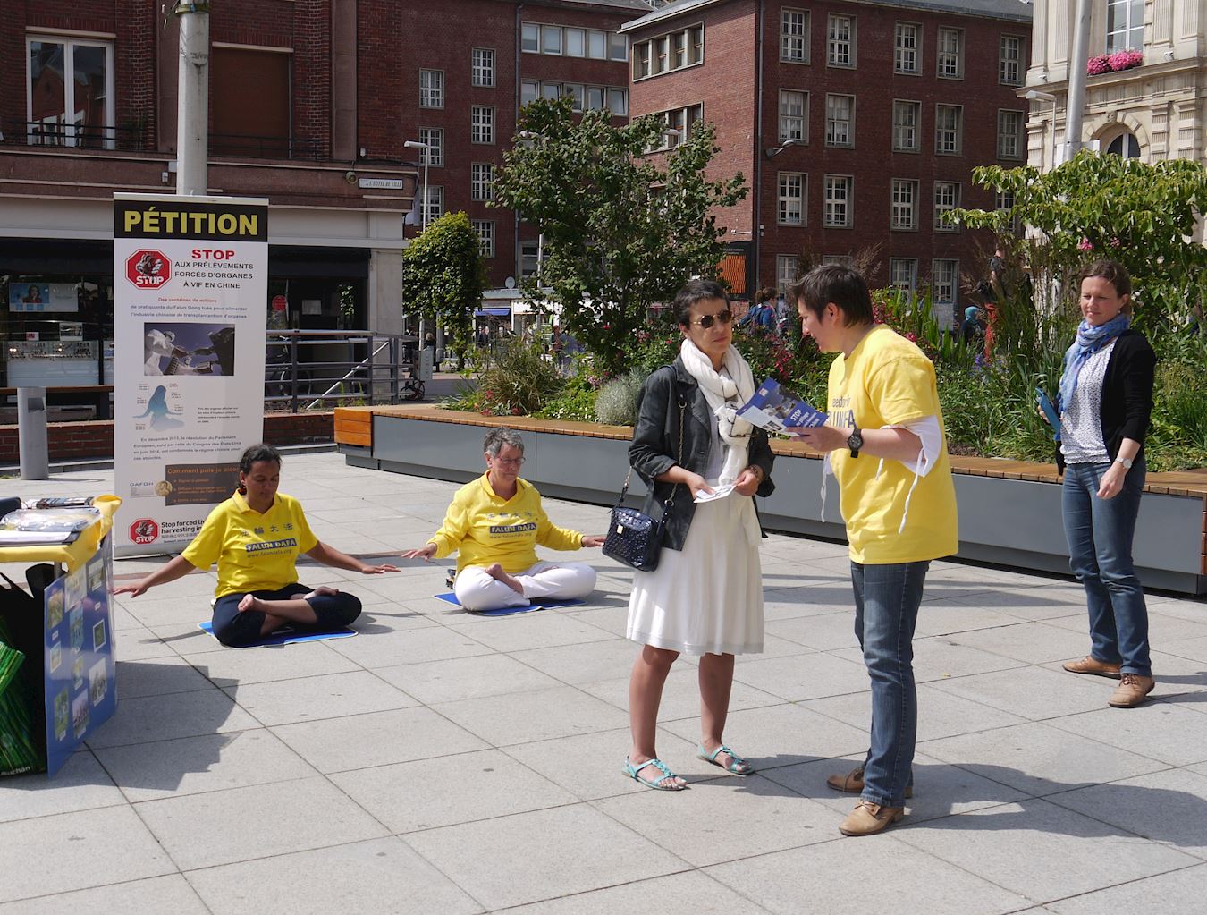 ![]() 图4:法国阿密安市政府广场上,游人驻足了解法轮功,签名支持法轮功反迫害 |