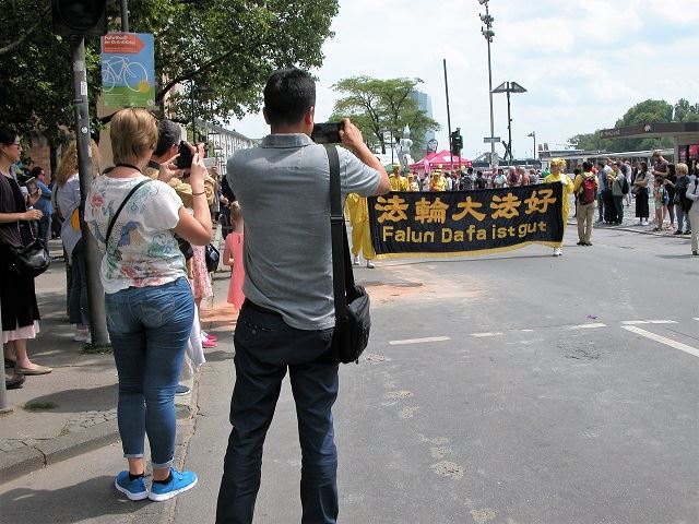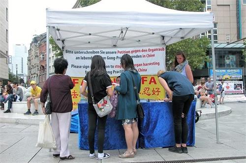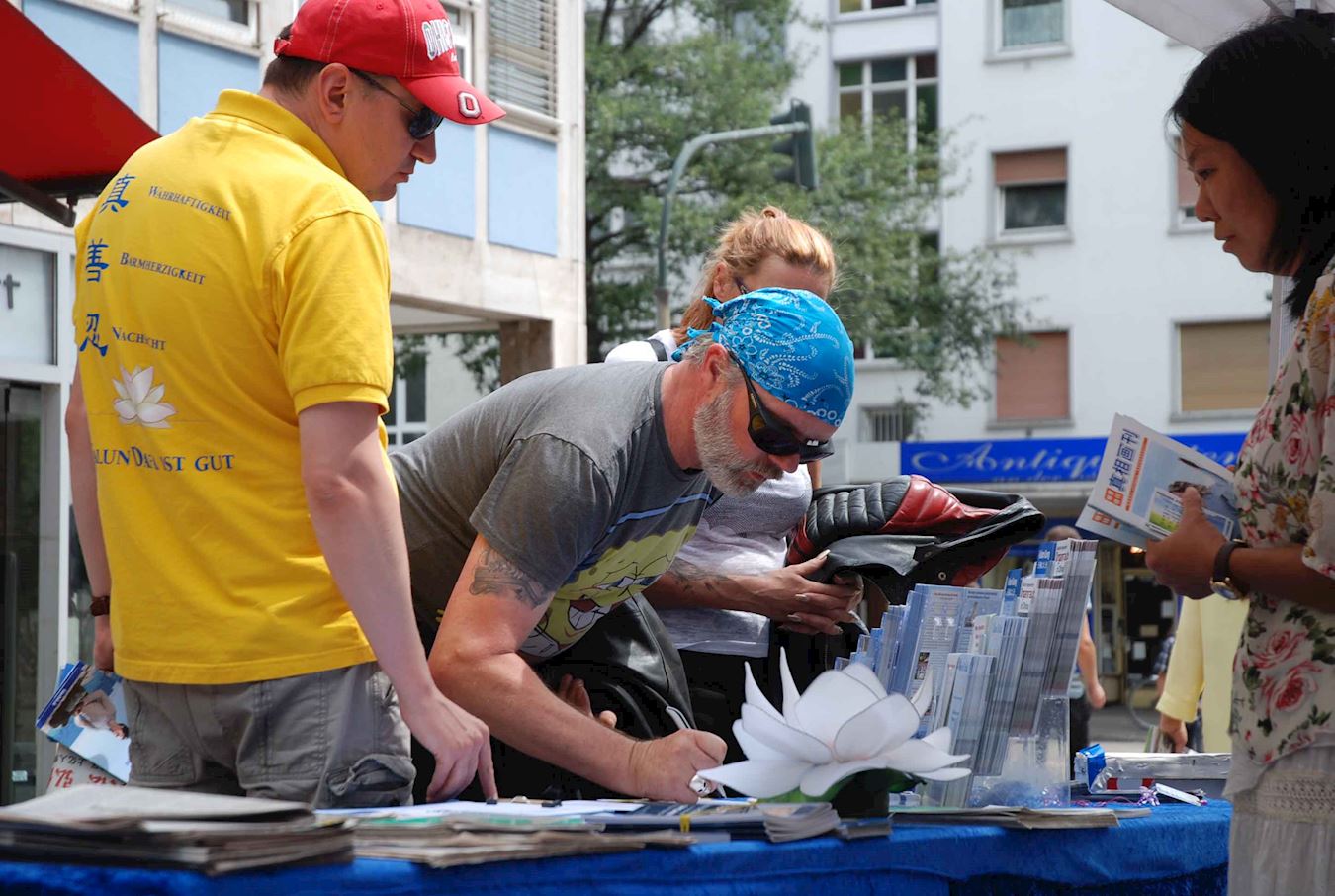 一位约三十岁的年轻人和他母亲路过,母亲让他接过传单,看他不明所以的样子,边上的学员告诉他法轮功是什么以及正在中国发生的迫害,他听说中共活摘器官的事后非常吃惊,问他能做些什么。走去签名时,这位年轻人对学员表示,(在这样的迫害面前)他完全说不出话来了。随后他的父亲和太太也来了。除了那位年轻人,其他家人都不懂德语。那位父亲在读了法语的传单后露出非常感兴趣的样子,并对学员竖起了大拇指。