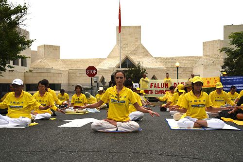 图1~2:部分美中南的法轮功学员们来到中国驻华盛顿大使馆前,以炼功打坐的方式呼吁停止迫害。 |
