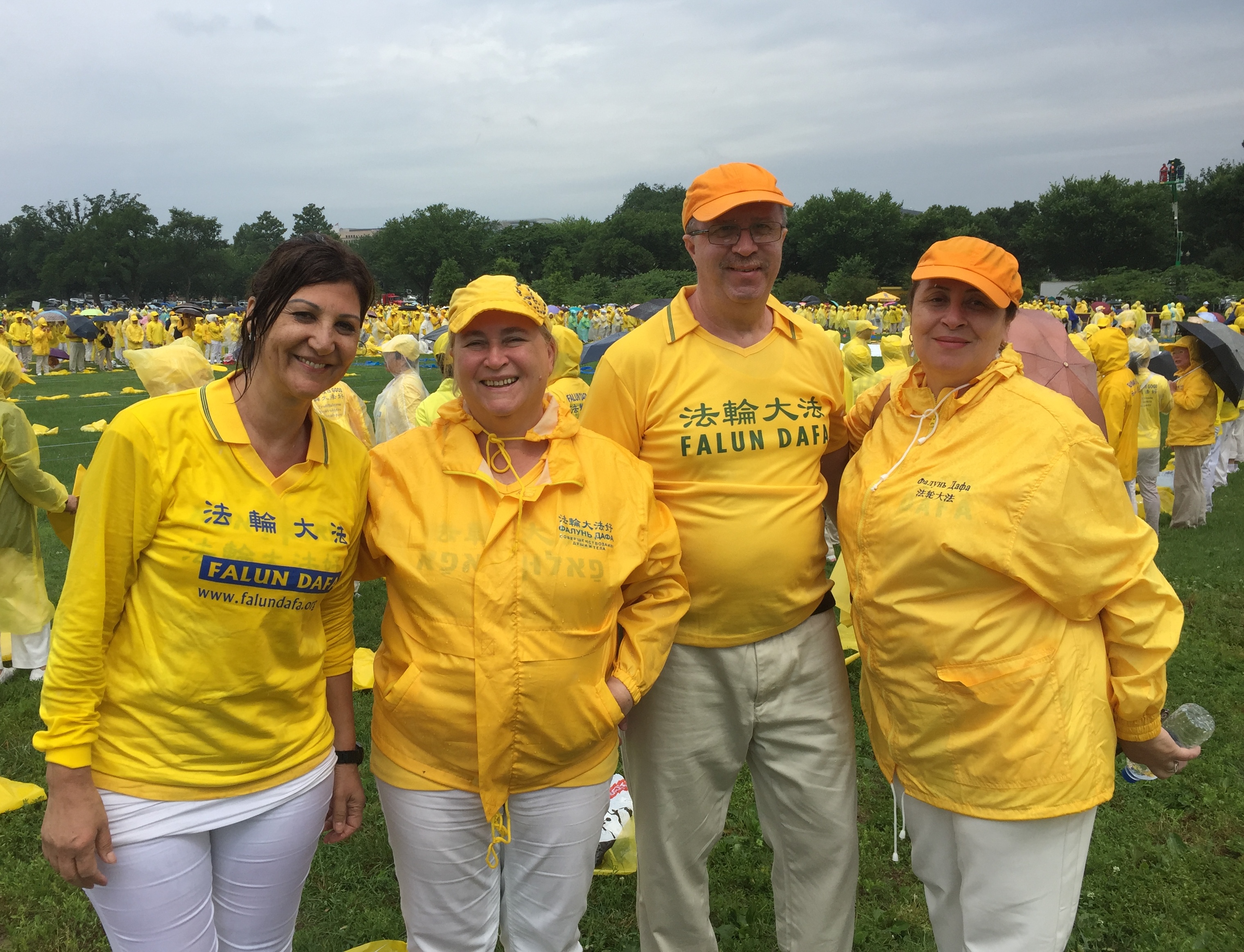 ![]() 图3:来自以色列的法轮功学员迈克(Micheal,右二)与妻子(右一)和其他以色列学员冒雨参加了二零一八年六月二十二日在美国华盛顿的大型排字活动。(容法/明慧) |