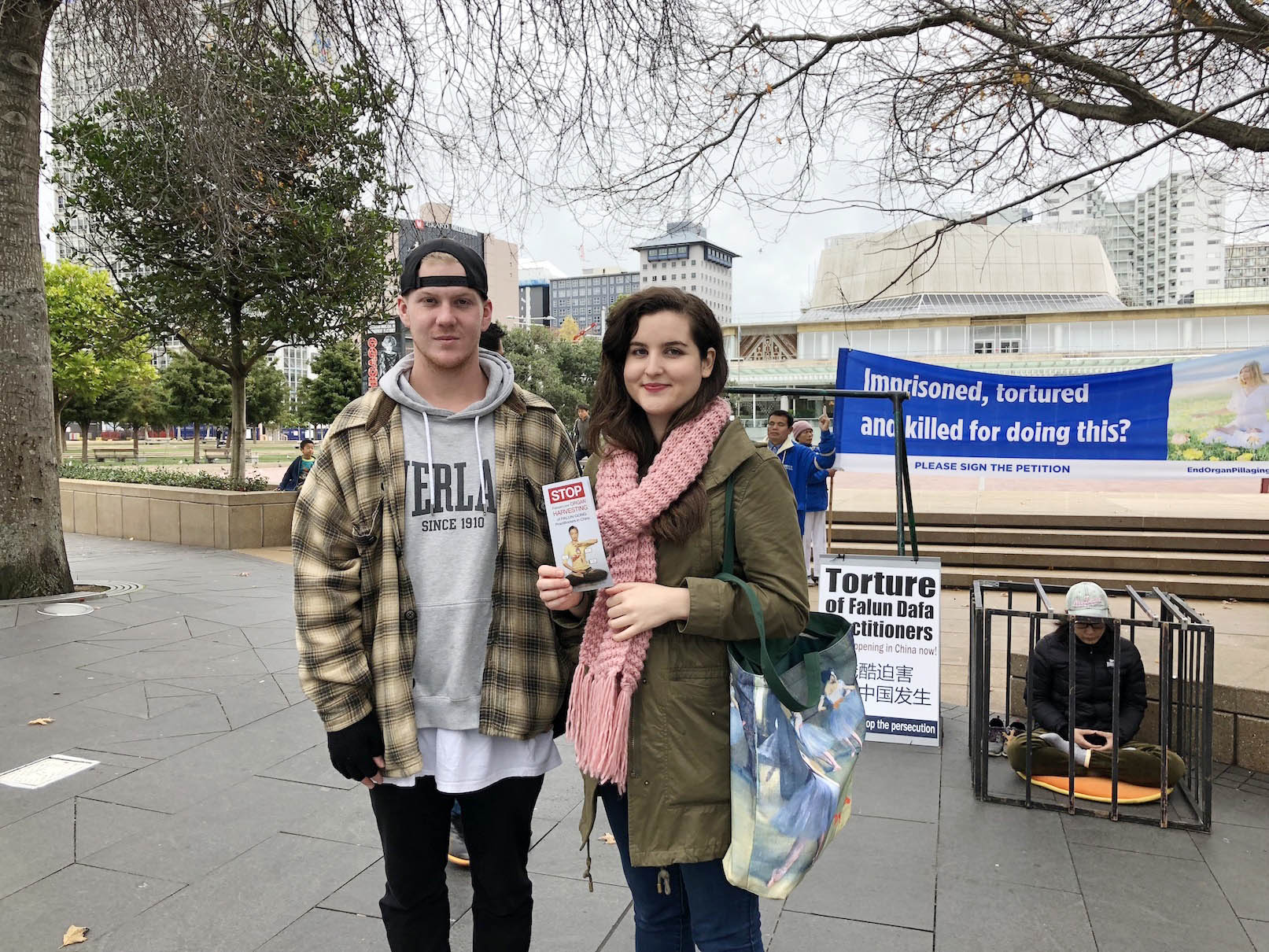 詹姆斯·卡特(James Carter)和莎拉·卡特(Sarah Carter)是一对兄妹,他们在酷刑展前看了许久,并询问了许多问题,当得知在如今的中国正在发生着这样一件骇人听闻的反人类的活摘器官事件,詹姆激动地说,他们希望新西兰政府能做点什么,整个世界都应该一起来支持法轮功学员维护人权,中共实在太腐败了(too corrupt)。莎拉还表示,“这个(西方自由)社会早就应该为你们做些什么了。”他们以后会帮助法轮功学员传播真相,让更多人来了解和支持法轮功。