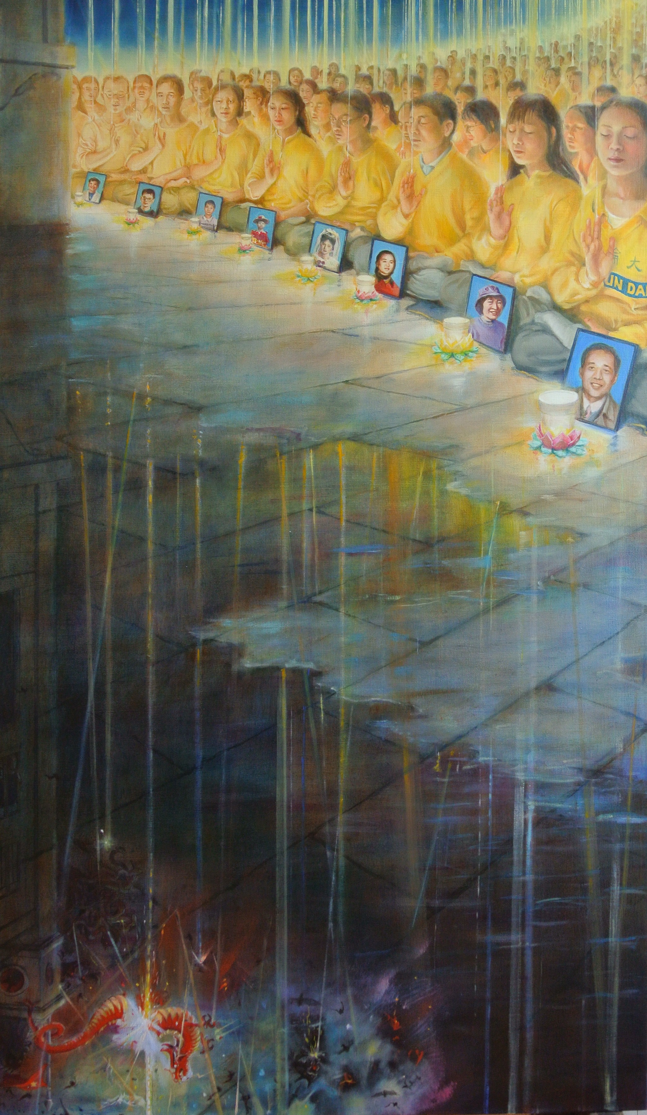 说明:在中共对法轮功的迫害中,没有人知道到底有多少法轮功学员被迫害致死。世界各地的法轮功学员常在所在地的中国领事馆前举行烛光守夜,悼念被迫害致死的同修。画的上半部展现法轮功学员发正念的场景,下半部分的水洼折射出另外空间对应的景象。