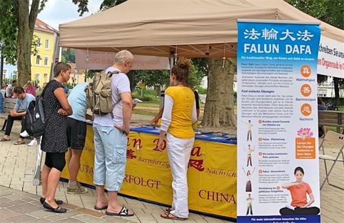 法轮功信息台设在商业步行街路口,和总火车站相连的必经之路上。人来人往,川流不息。信息台展示的信息吸引了不少民众来了解法轮功以及在中国发生的对法轮功学员的迫害,许多民众了解真相后签名支持制止迫害。