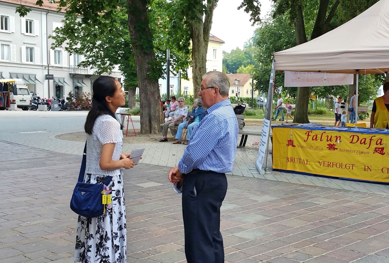 几个小时之后,贝恩德又回到法轮功学员的真相点,他表示想知道更多关于法轮功的信息。他说自己曾经去过印度,也读过很多关于老子、孔子的书,他也打坐,并且相信打坐、修行可以使人和上天相连。学员告诉他法轮功就是一种佛家修炼大法,按照真、善、忍的原则修炼自己。他很感兴趣,拿了很多关于法轮功的报刊和传单。