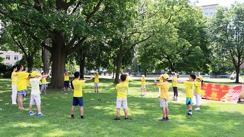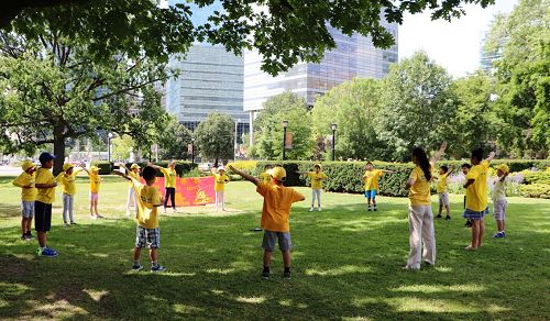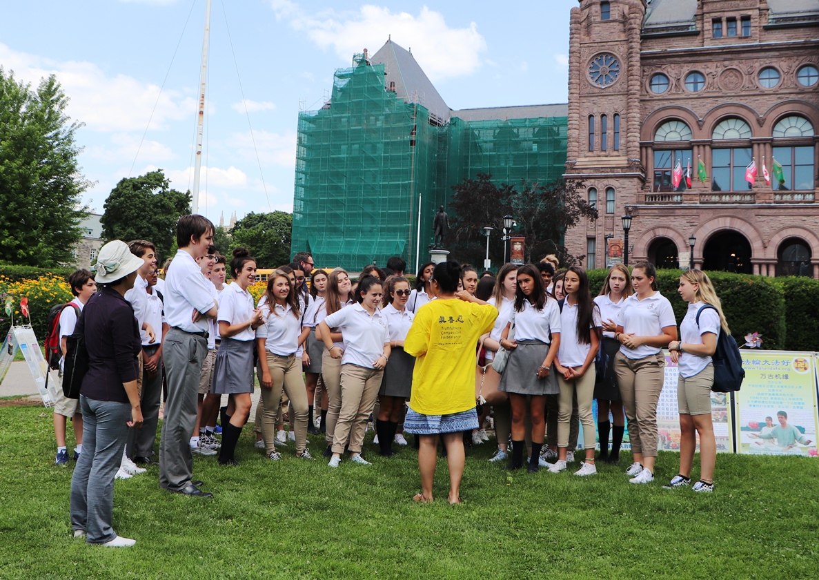七月十一日一早,明慧学校中班的法轮大法小弟子们(八岁至十岁)在幽雅的公园里开始炼功,巧遇了一个由四十七位学生组成的夏令营,他们来自安省的圣托马斯-维拉诺瓦学院(St. Thomas of Villanova College)。学生们非常有兴趣要跟法轮大法小弟子们学功,经过他们的领队老师同意,明慧学校的老师索尼娅(Sonia)给学生们介绍了法轮功,他们就分成男生一组,女生一组学起了五套功法。
