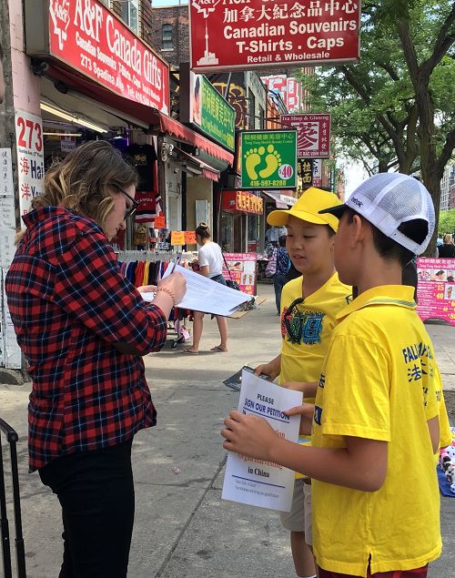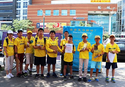 明慧学校大班的法轮大法小弟子们(十一岁至十三岁)这天是到唐人街发真相资料和征集反迫害签名。