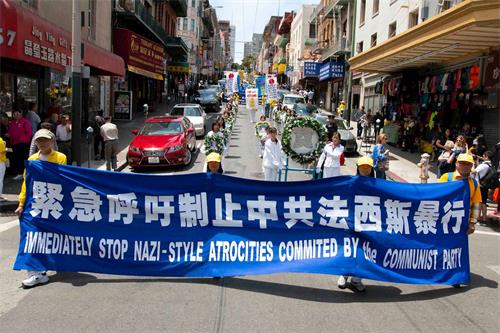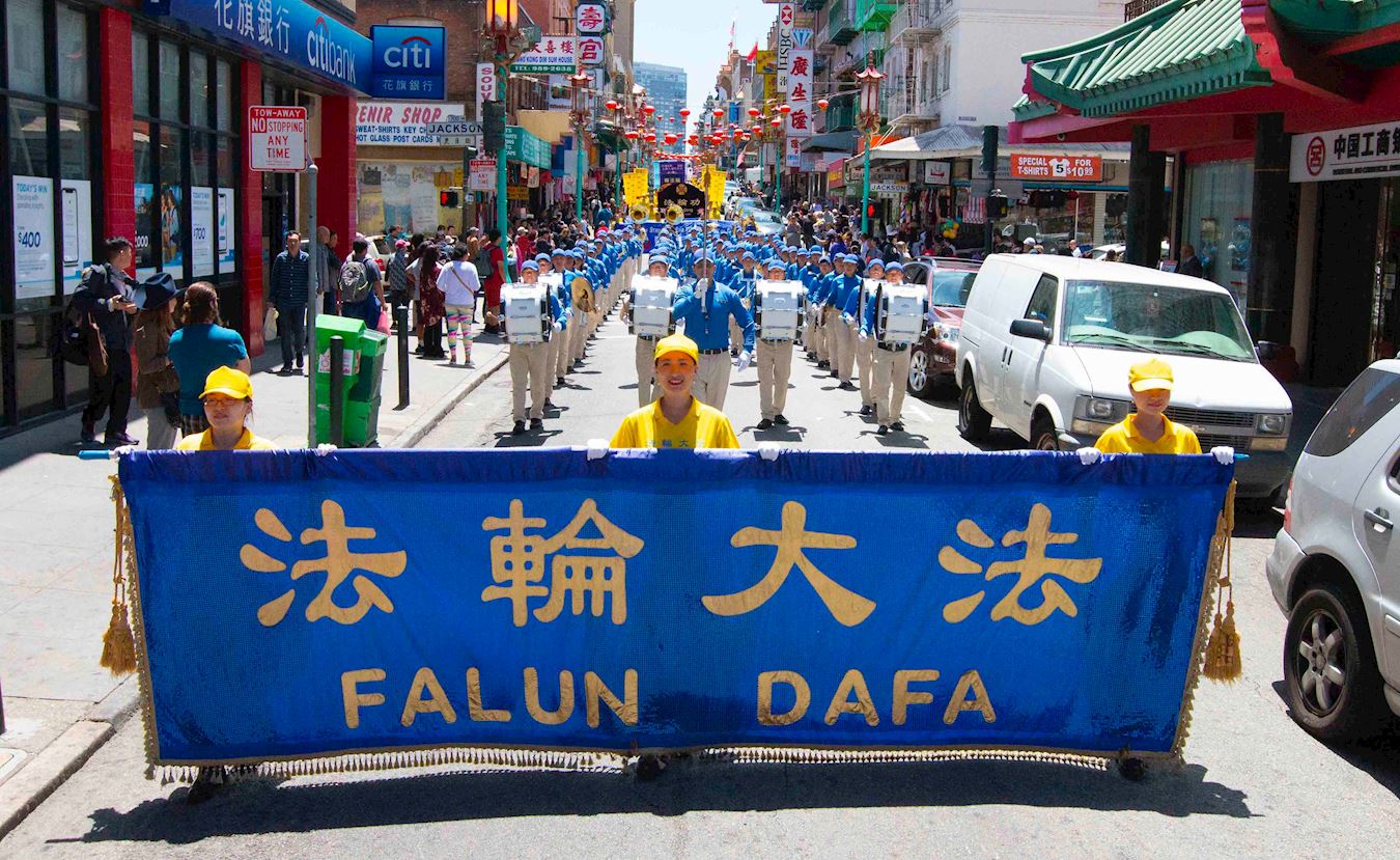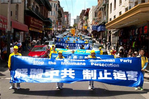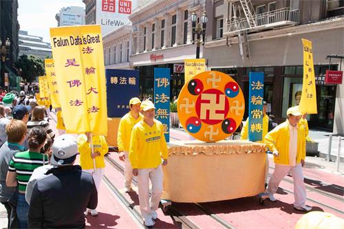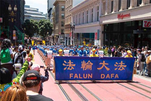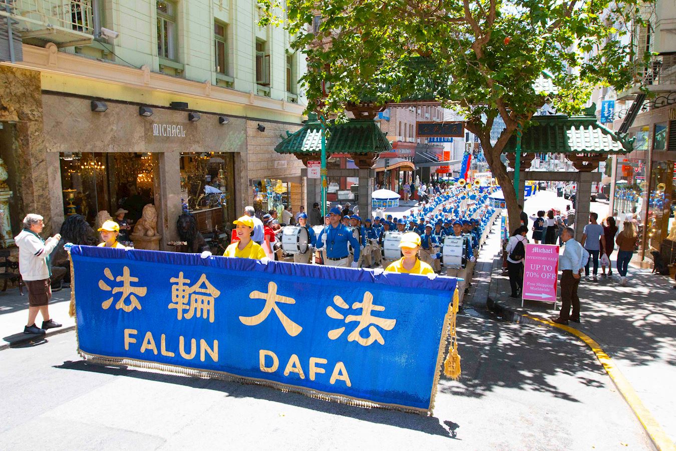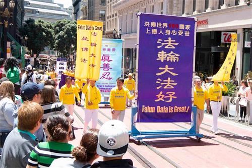 中午十二点由气势磅礴的天国乐团演奏雄壮的乐曲领队,法轮功学员游行队伍开始从旧金山市政厅广场出发,经过主要大道市场街,再经过联合广场,环绕中国城后结束。