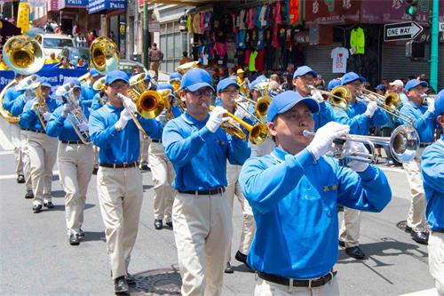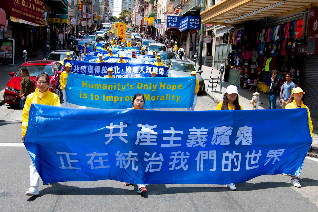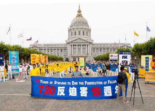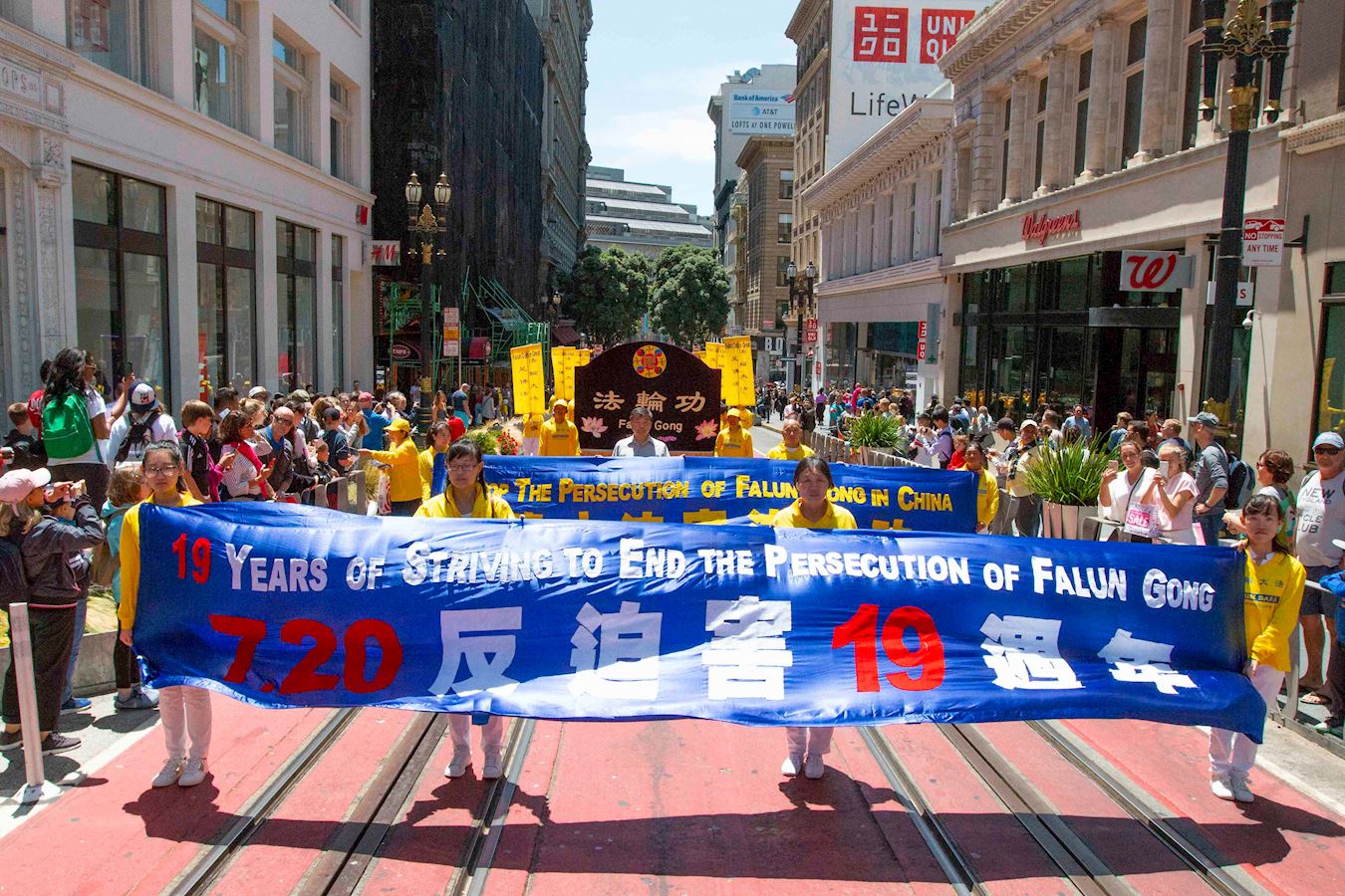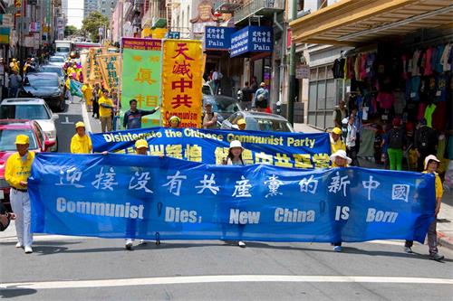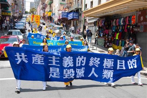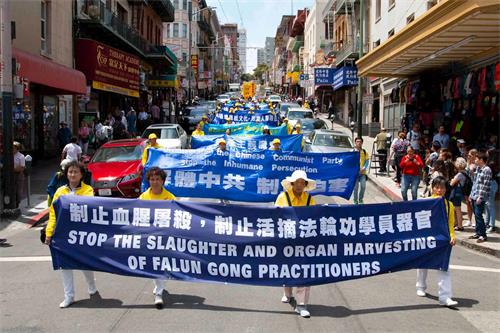 中午十二点由气势磅礴的天国乐团演奏雄壮的乐曲领队,法轮功学员游行队伍开始从旧金山市政厅广场出发,经过主要大道市场街,再经过联合广场,环绕中国城后结束。