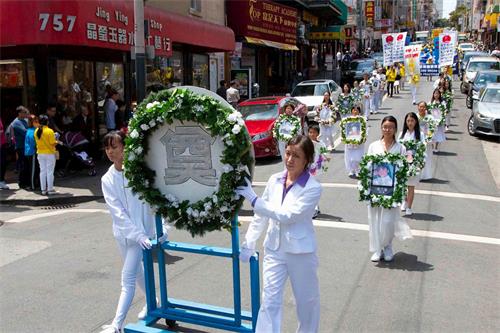 游行队伍由四个方阵组成:第一方阵是法轮大法好,由美西天国乐团、橫幅队和炼功队组成;第二方阵是停止迫害法轮功。由身穿白色服装的学员手持被迫害致死同修的遗像,和要求制止中共法西斯暴行等横幅队组成;第三方阵是全球起诉江泽民。法轮功学员举着展板向人们展示江泽民的罪行。第四方阵是《九评》、退党、讲真相方阵。他们举着声援三亿九百万中国人三退的横幅和展板,呼吁民众赶快退出中共的邪恶组织。