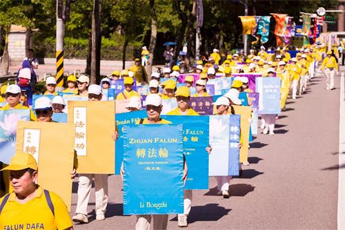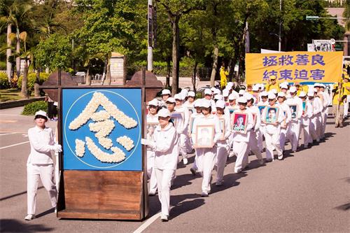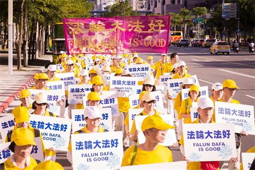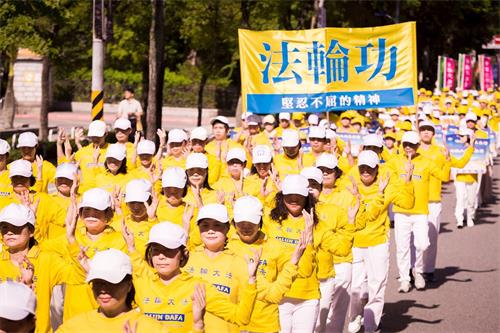 下午三点三十分由气势磅礡的天国乐团演奏雄壮的乐曲领队,法轮功学员游行队伍开始出发,后面有“大法洪传”,“千古奇冤”,“结束迫害”等整齐的队伍,行经台北市政府及各大学等文教区域,穿越台北最繁荣的信义商圈与东区街头,终点抵达台北市政府市民广场,全程共四点二公里。