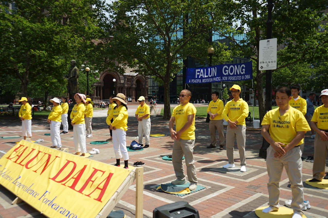 '图1~2:法轮功学员在波士顿市科普利广场炼功'