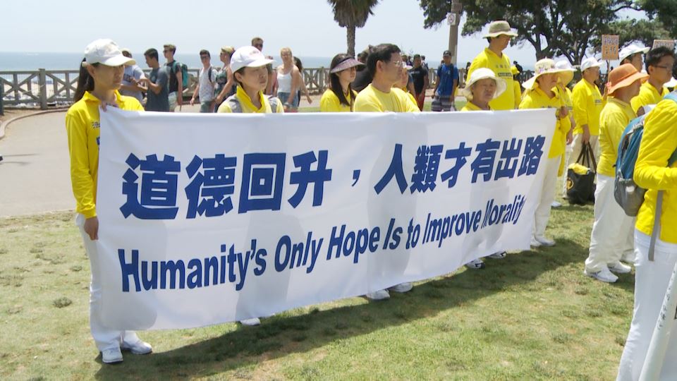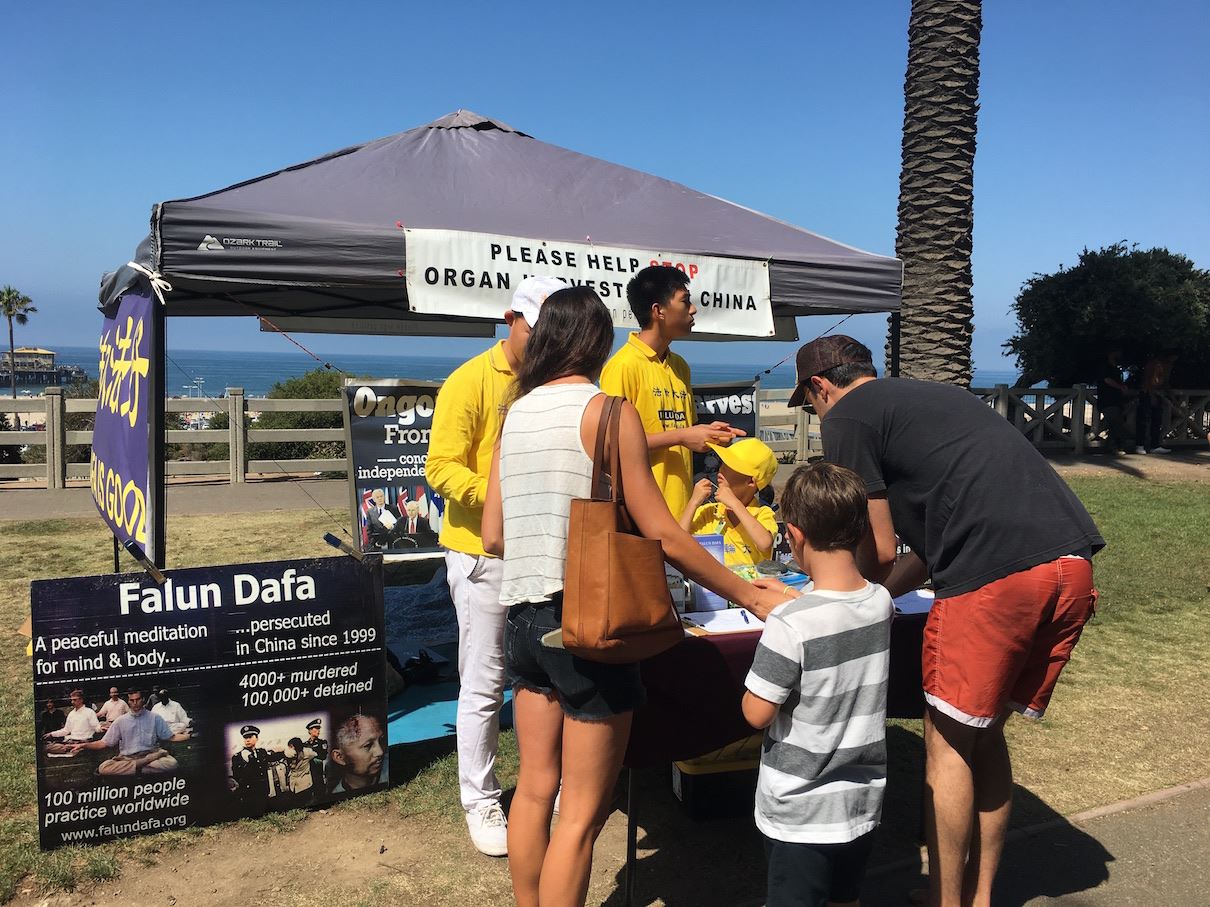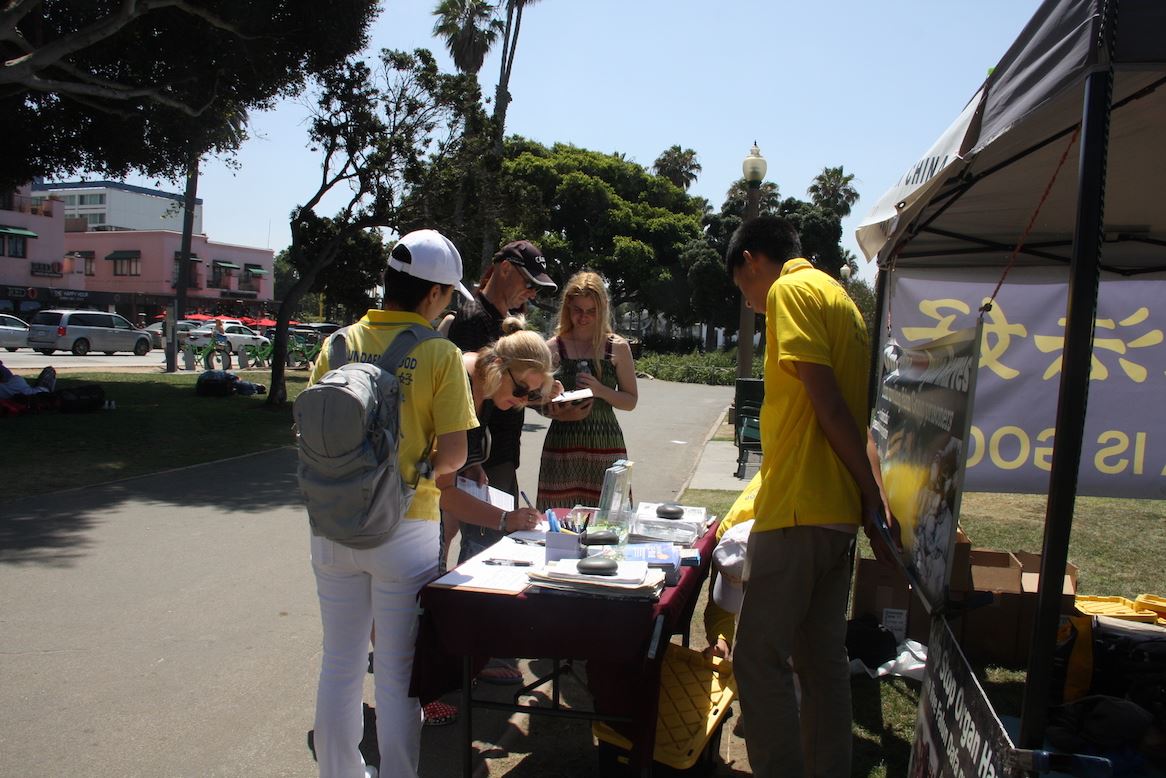 当听闻如今中共还在继续活摘法轮功学员器官,四名从橙县到圣莫妮卡海滩游玩的年轻女孩,毫不犹豫地在呼吁制止活摘的征签表上签名。其中一名叫Fereshteh的女生说:“我之前并不了解法轮功,但‘真、善、忍’没有错。看到她们平和在炼功时,我也深受吸引。希望我们可以帮助停止这么残忍的事情。