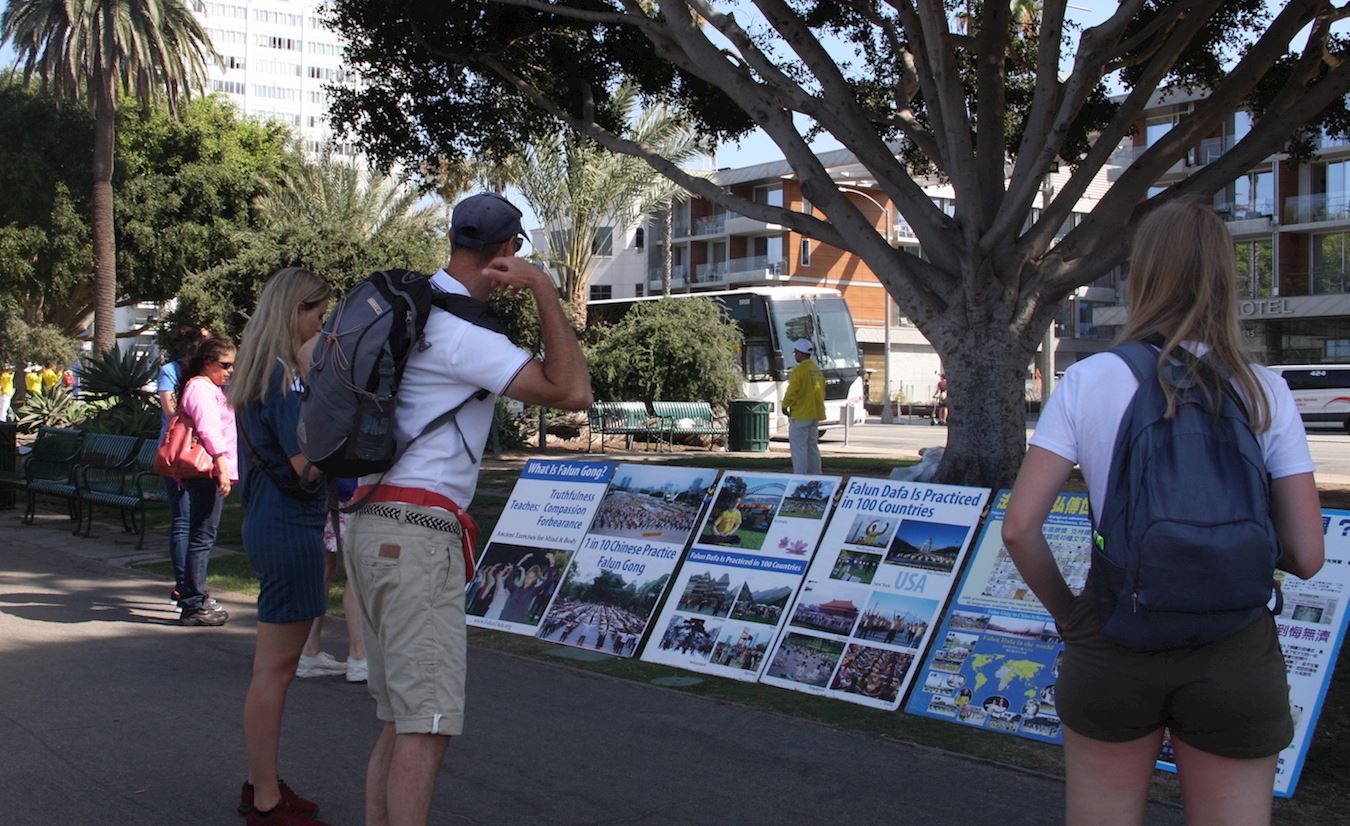 集会现场引起很多游客的关注。他(她)们在呼吁制止活摘的征签表上签名,驻足阅读真相展板,与学员交谈询问问题。