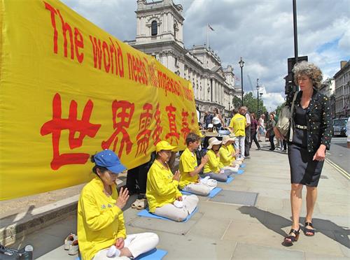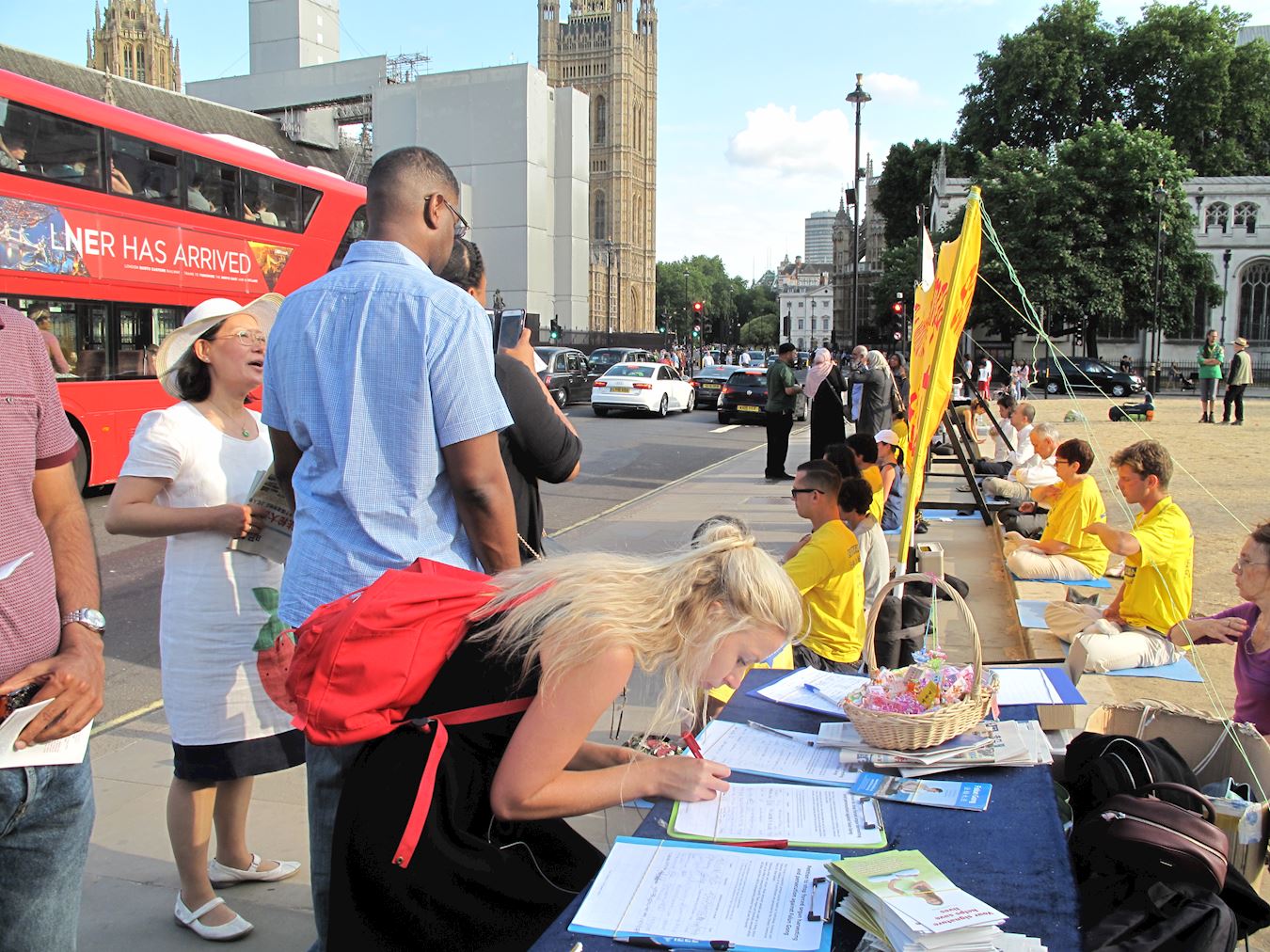 在持续十个小时的活动中,很多人接过法轮功真相传单、驻足听法轮功学员讲真相、签名支持法轮功学员反迫害,他们当中包括来自世界各地的游客,也有不少英国人,他们都表示希望为尽早结束迫害贡献一己之力。