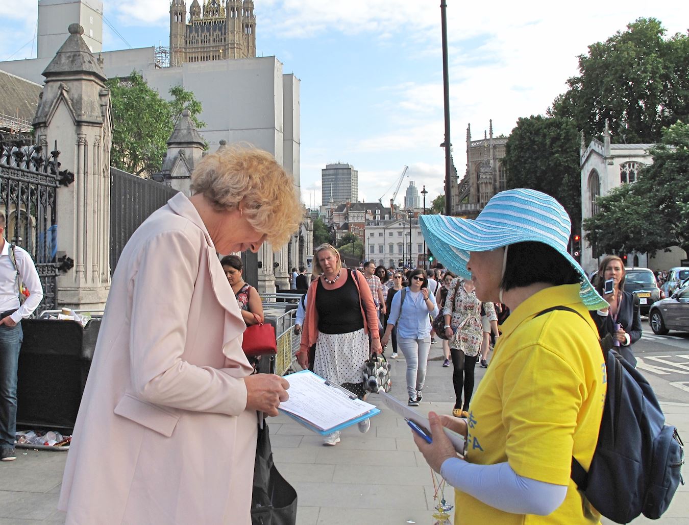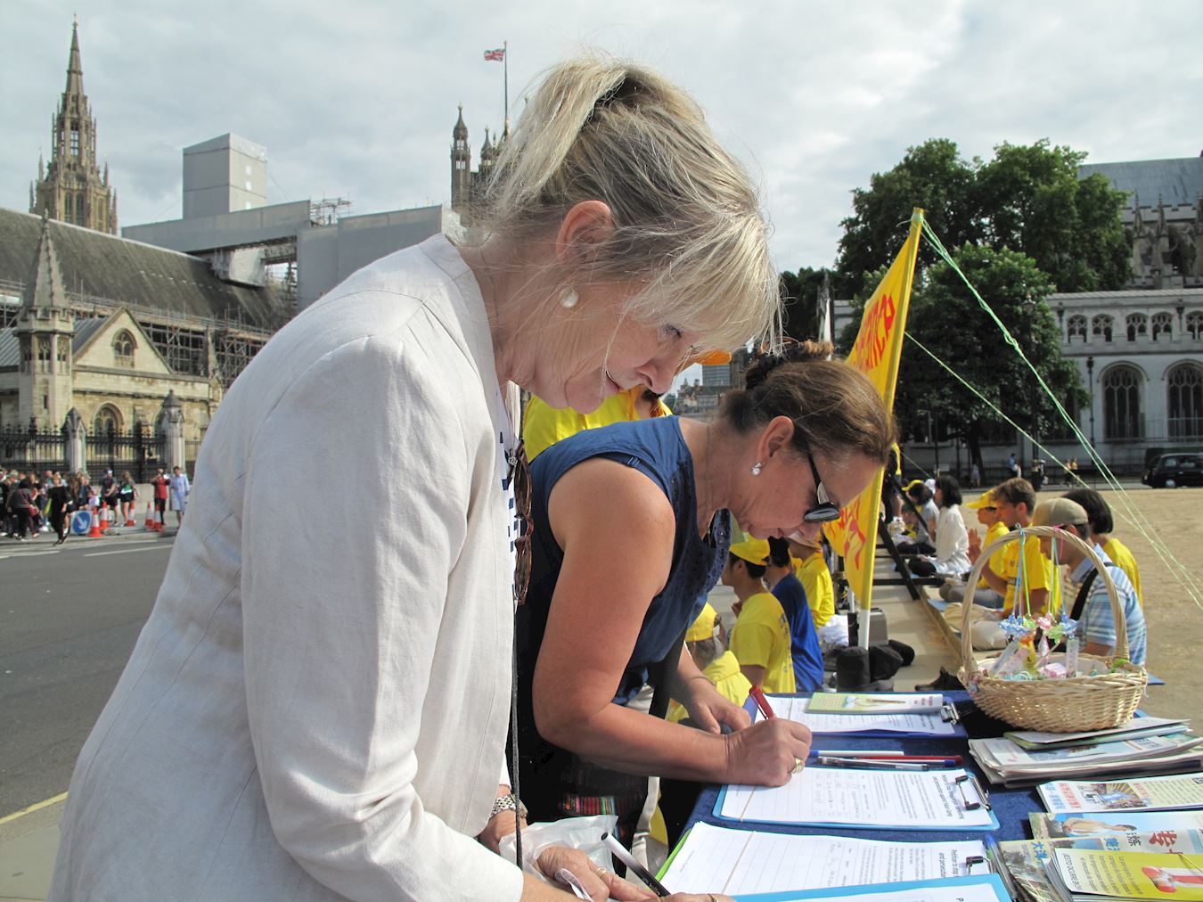 ![]() 图11:这位年轻伦敦女士介绍自己是做媒体工作的,她这制止迫害征签表上签名,并说回去后会让更多人知道。 |