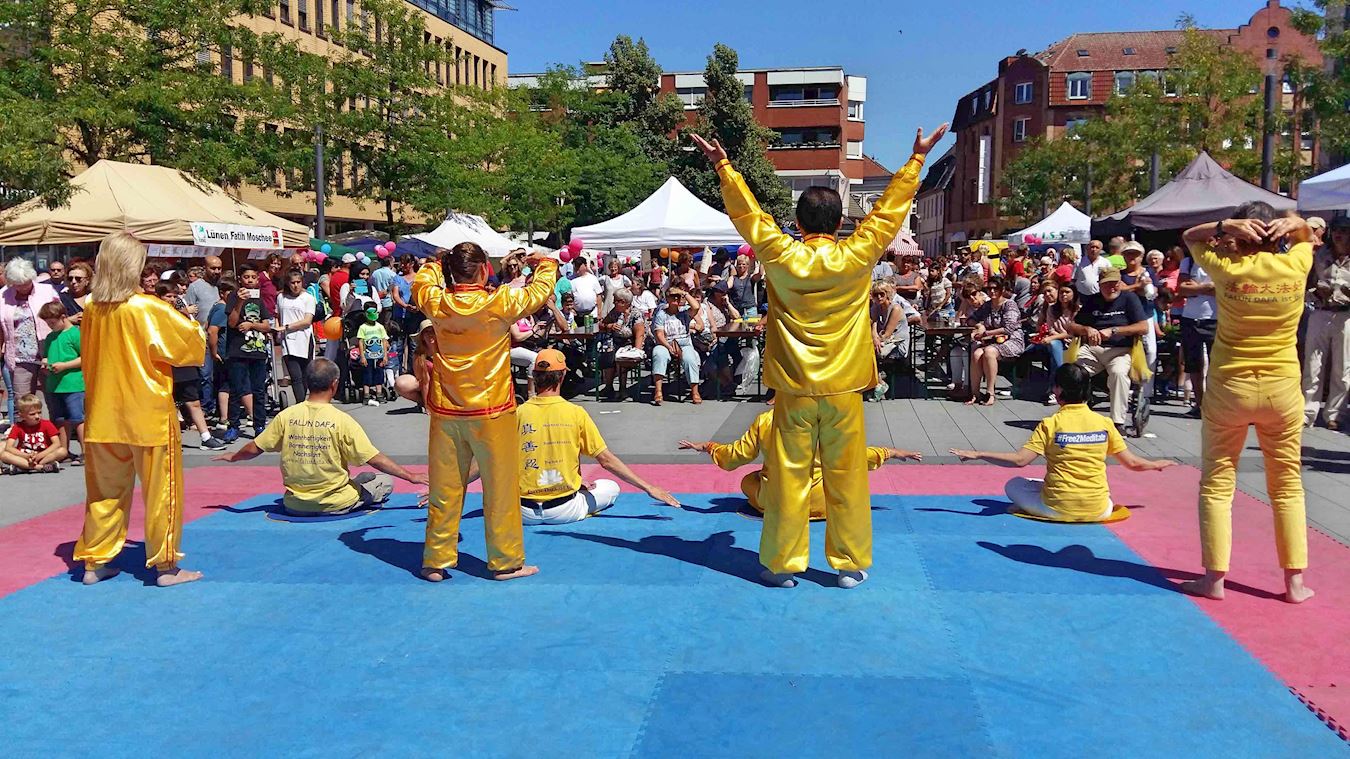 【明慧网二零一八年七月二日】二零一八年六月三十日,德国西部北莱茵-威斯特法伦州的绿嫩市迎来了第三十五届多元文化城市节,法轮功学员在舞台上的功法展示深受当地民众欢迎,德国政治家们还和法轮功学员一起学炼功法。