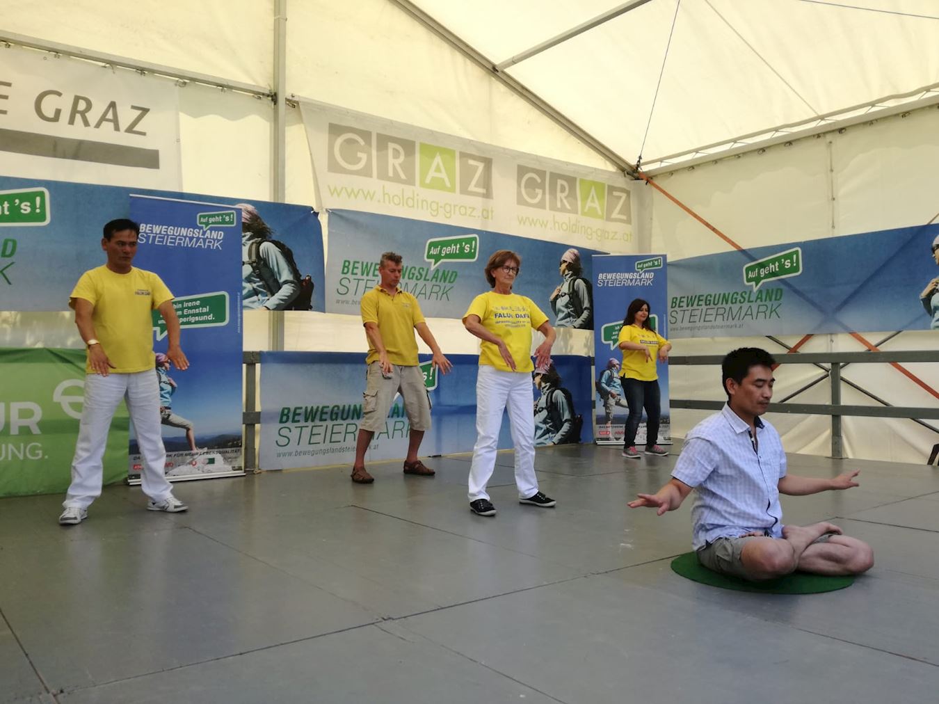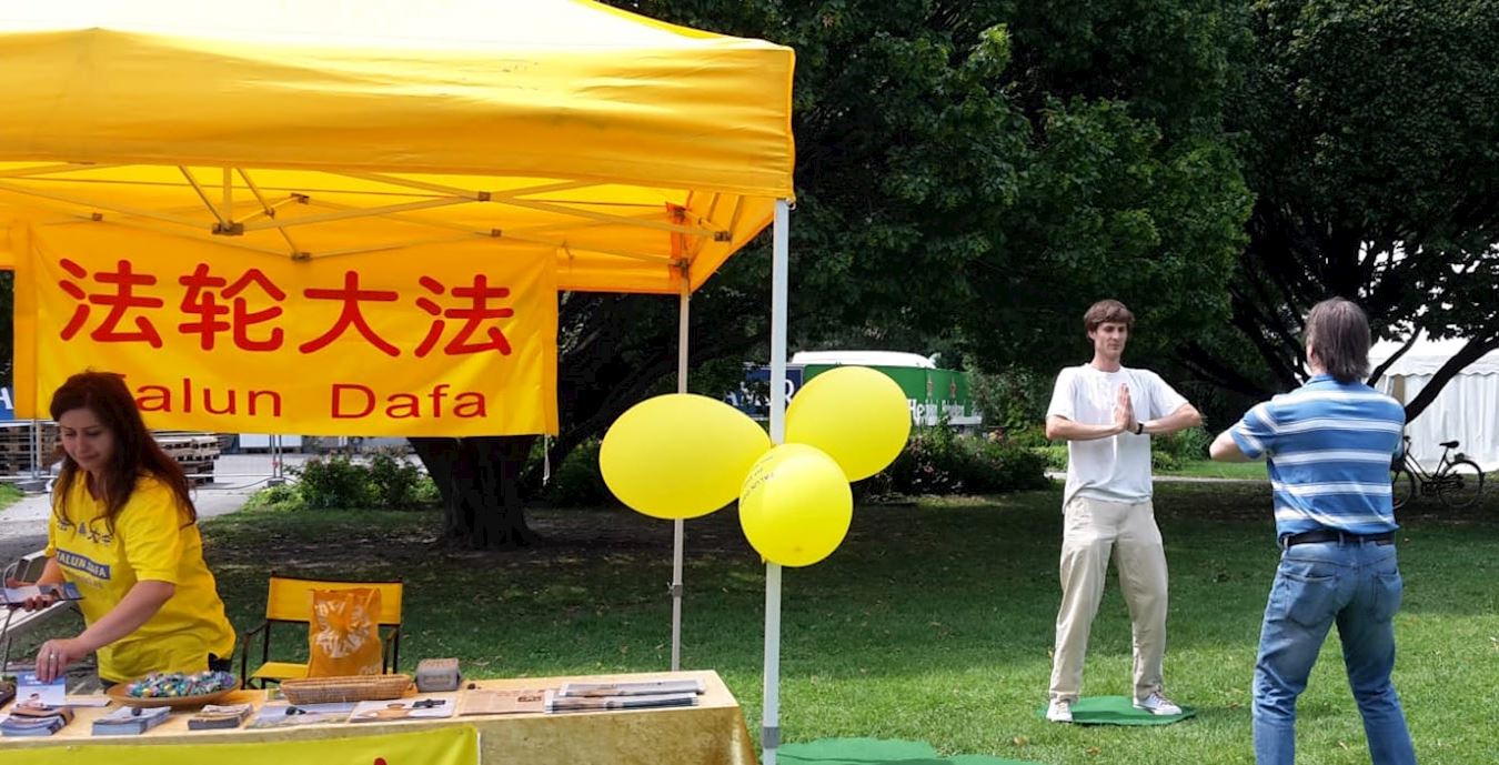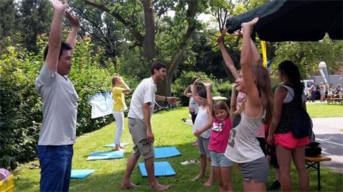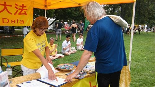 在奥加唐(Augarten)公园节上,法轮大法展台吸引了很多民众,无论是年轻人还是年长的居民,人们纷纷学炼法轮功。很多民众也详细倾听了法轮大法修炼者在中国受到迫害的情况。当他们得知法轮功修炼者因为活摘器官而死,而且他们的器官还被系统地组建成器官库后,觉得匪夷所思,纷纷在展板上签名支持法轮功,希望可以帮助法轮大法学员。