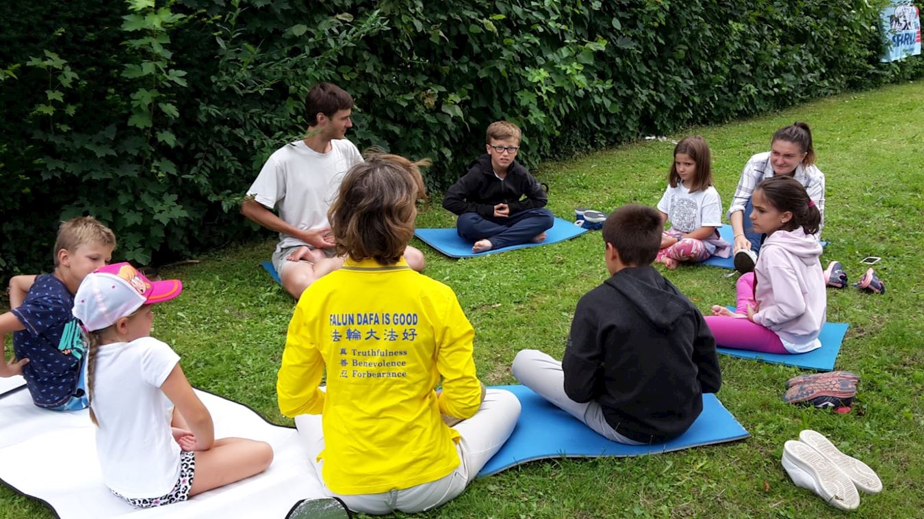 在格拉茨城市公园举行的家庭节上,孩子们都非常勤劳的收集盖章用来参加节日最后的抽奖活动。但是当他们来到法轮大法展台学习功法时,他们忘记了要收集盖章,而是沉浸在安详功法的愉悦之中。家长们很高兴地给他们拍照,耐心等待着他们。有一对姐妹和法轮功学员握手告别并且认真的告诉学员,她们会到每周的炼功点来学功。
