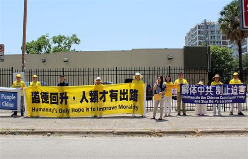 ![]() 图1~2:二零一八年七月二十日,休士顿学员顶着烈日在中领馆前 集会,纪念反迫害十九周年。 |