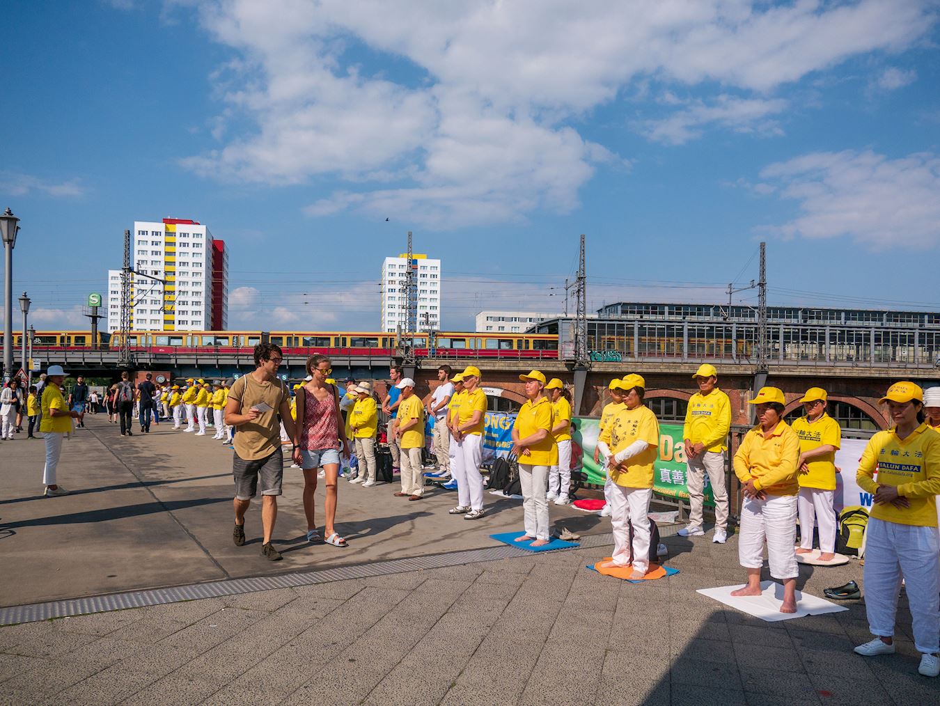 在德国中使馆前,每天有大量的中国游客来作短暂停留,亚历克斯说:“他们并不是所有人都愿意接受资料,可他们总停留在我们的周围,观看横幅,观察我们的行为举止。有些人离开的时候,面带笑容,我觉他们认为我们很亲切。”
