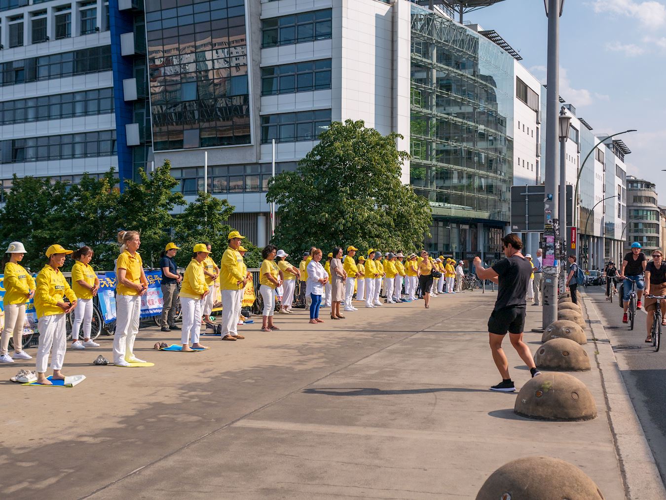 柏林的电影导演兼演员弗拉基米尔·维拉诺夫(Vladimir Vilanov)看到这么多法轮功学员在使馆前炼功,感到很震撼,拿出手机不停地拍摄对着学员炼功的场景,说:“这能唤醒更多的人。”