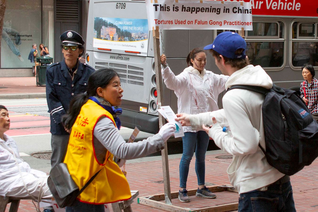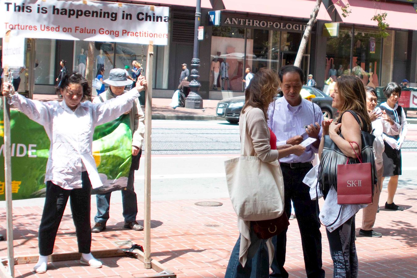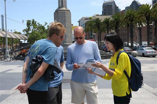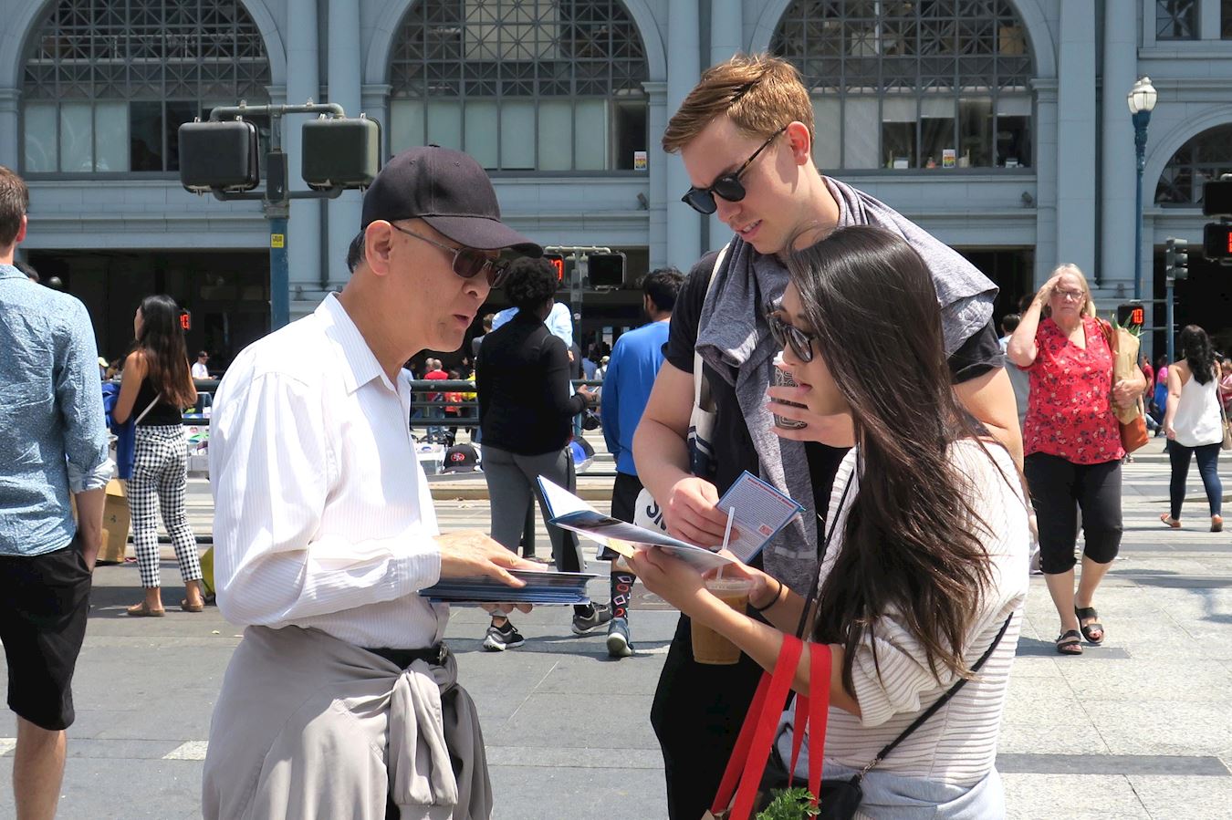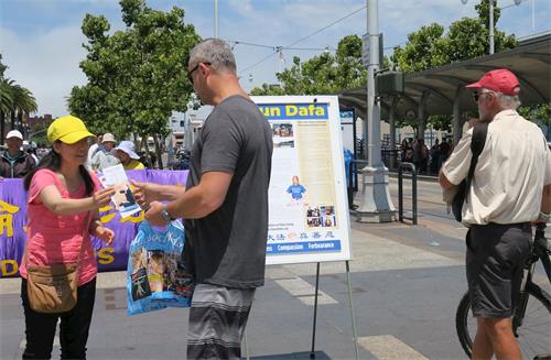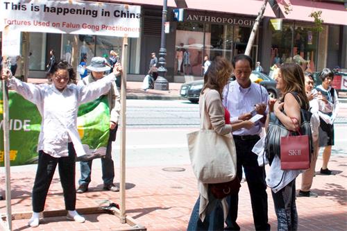 【明慧网二零一八年七月二十二日】(明慧记者贾维、王英美国旧金山报道)七月二十一日,旧金山湾区法轮功学员在举行七二零迫害十九年活动之际,在旧金山渡轮大厦前和购物中心分别举行反酷刑展,让民众了解中共迫害法轮功的罪行。许多民众了解真相后纷纷谴责中共的暴行,并有大陆游客当场退出中共的团队组织。