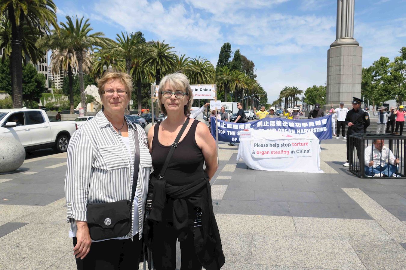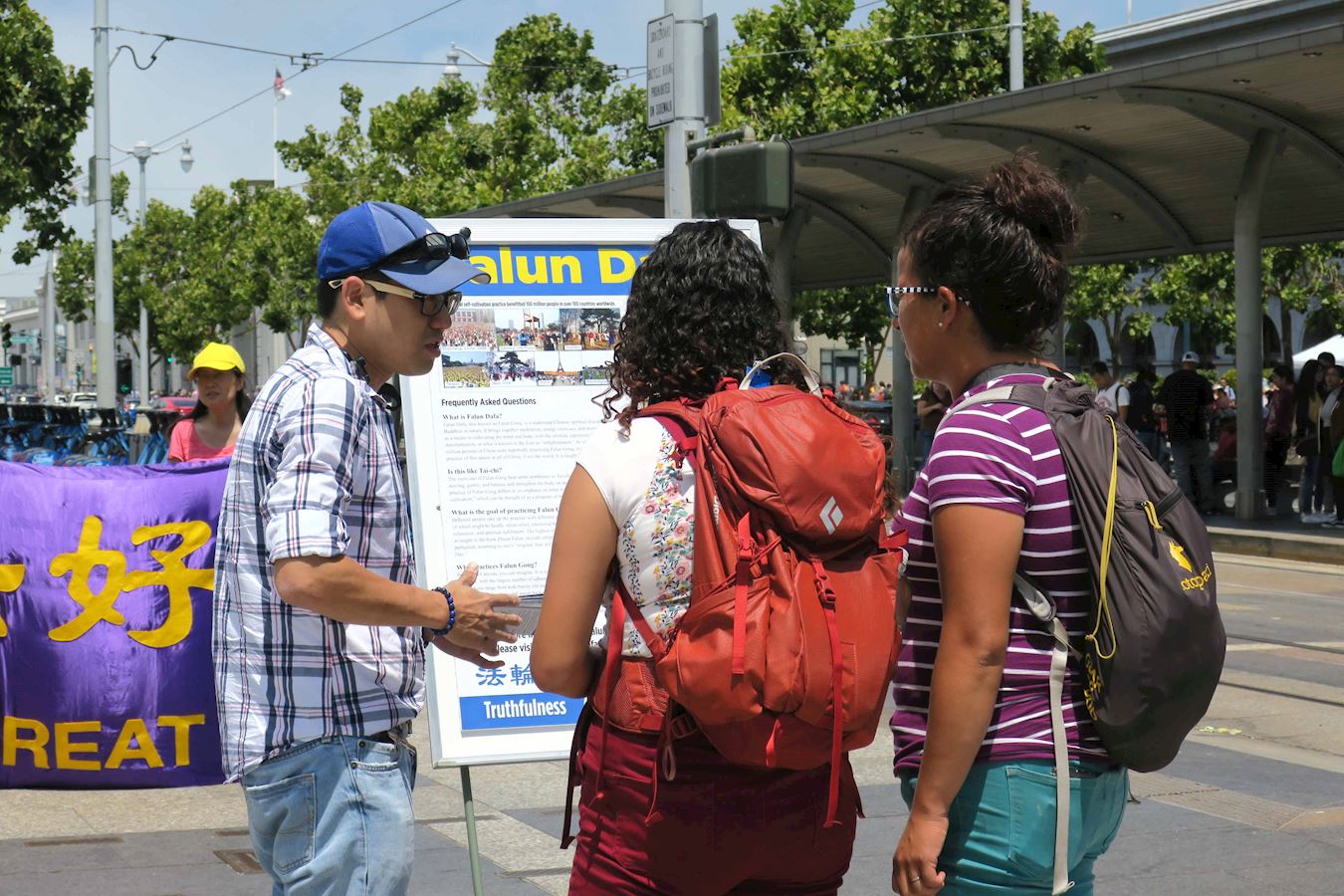 图9:从威斯康辛州来旧金山旅游的唐娜(右)和劳拉,迫切的想了解法轮功学员在中国受迫害的事情,也表示我能为你们做什么?