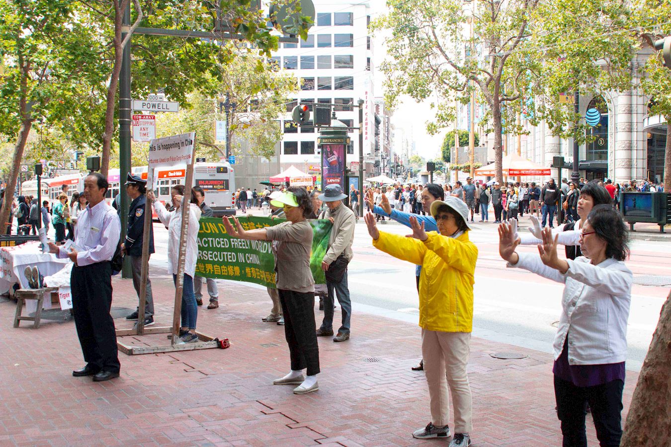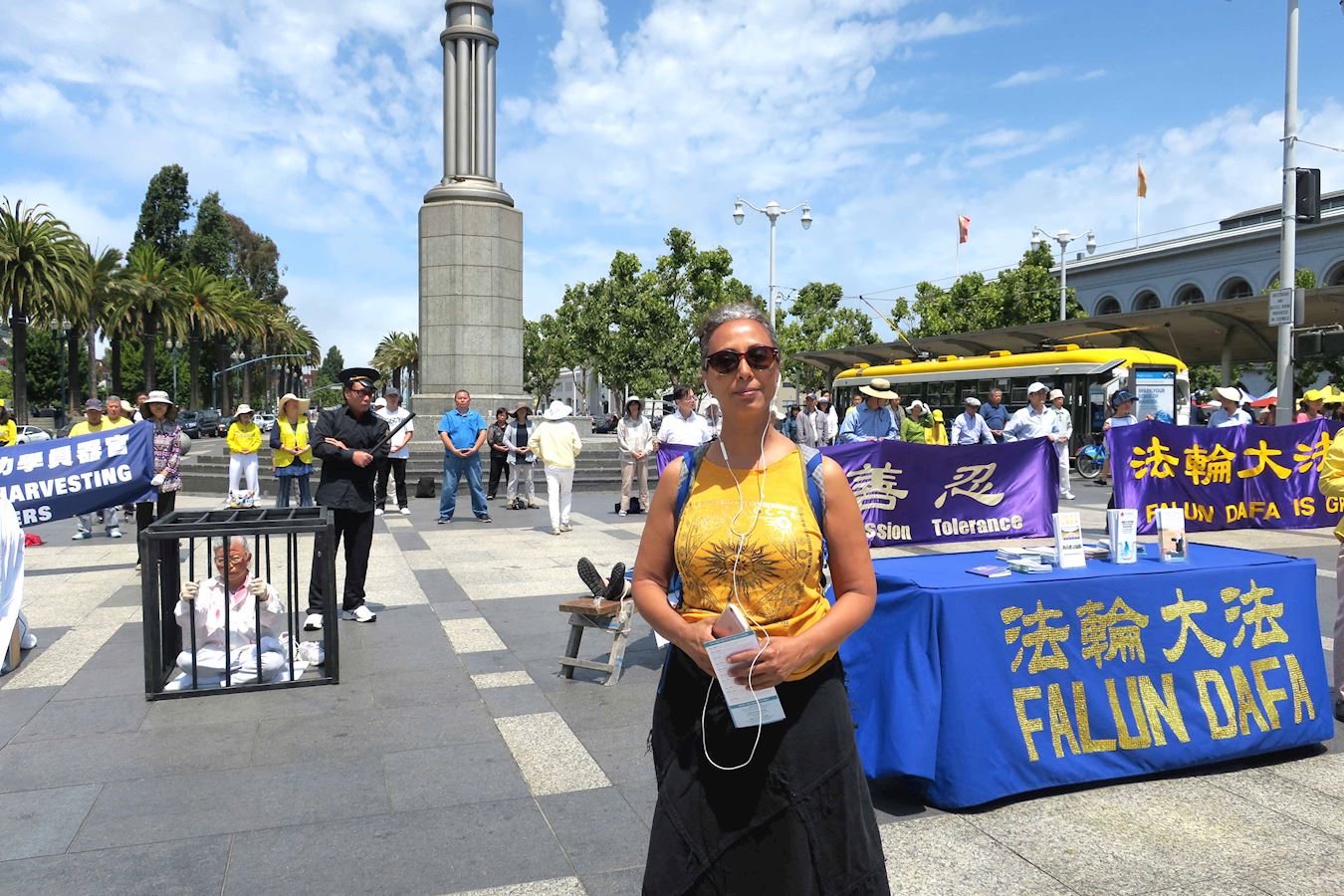 旧金山居民奥丽·德敏(Orli Demine )经过法轮功学员在举行反迫害活动时,被学员炼功的祥和之场吸引,也对法轮功学员在中国受迫害表示震惊。奥丽表示,“非常的震惊﹗强摘法轮功学员器官贩卖,怎么会有这种事情发生?谢谢你们来旧金山,告诉我们在中国发生的恐怖事情,你们做的非常好,我支持你们!”