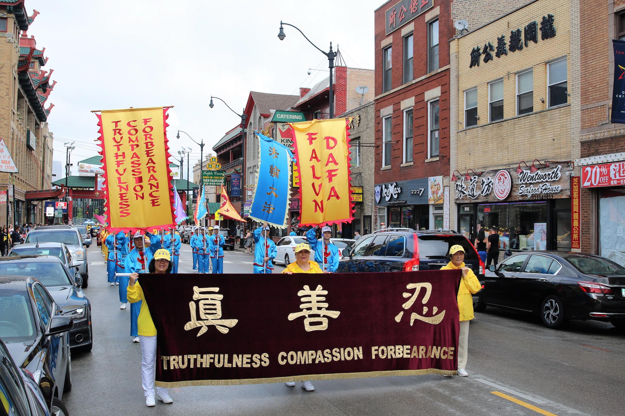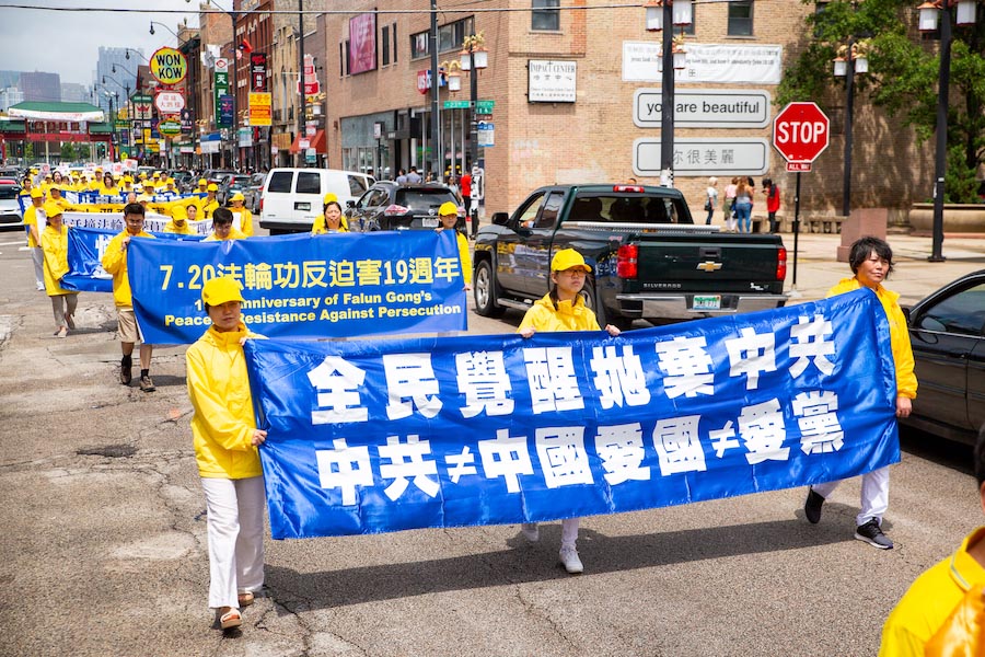 美国第三大城市芝加哥,其市中心的唐人街是美国东部规模最大、最繁荣的唐人街之一。法轮功学员们手持中英文“法轮大法好”、“真善忍”和“七二零法轮功反迫害19周年”等大型横幅,走上中国城中心的永活大街,在刻有孙中山手书的“天下为公”的地标式牌楼下穿过,路过著名的华阜广场,向中西方民众传递真相,呼吁制止迫害。