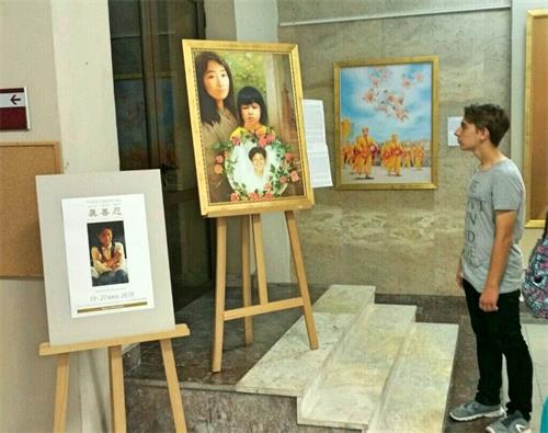 一个年轻人花了相当多时间观赏所有的画作并阅读注释,并仔细阅读了艺术品目录。当他合上目录时,眼里含着泪水。离开时,他没有分享自己的感受,只是拿了一份法轮大法的传单,静静地感谢。