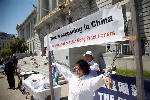![]() 图1~3:法轮功学员在旧金山市府前举办反酷刑展 |