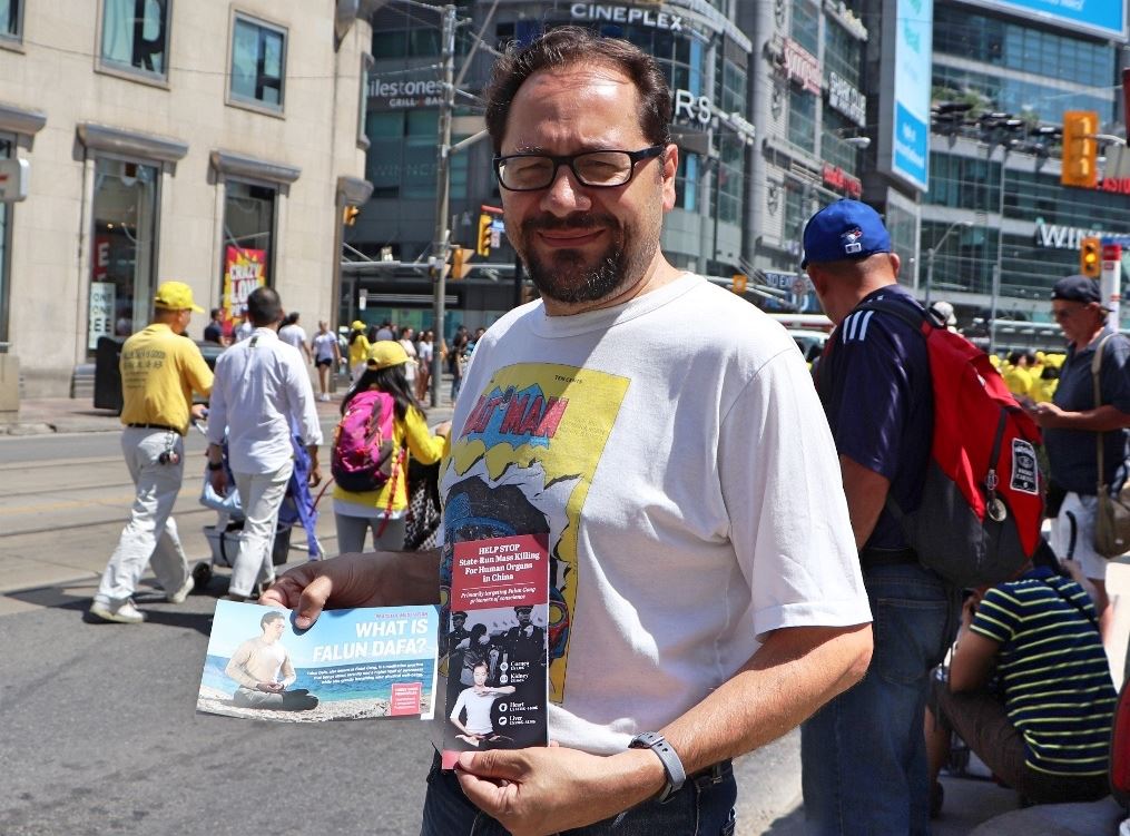 年轻人乔(Joe)是从美国来加拿大一家合资公司工作,他说:“我和同事在楼上听到乐团的演奏声就跑下来观看。这个游行令我很震撼。我妈妈是韩国人,我知道没有人喜欢共产党。看到法轮功学员被活摘的信息,我相信共产党做得出来,我很伤心。其实共产党从一开始就是邪的东西,但它最终是要被历史淘汰的。”