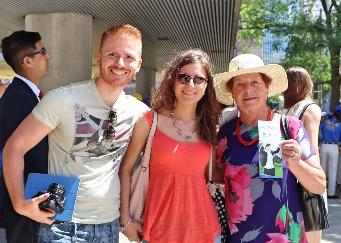 图15:退休前是医院护理师的米舍利娜(Micheline,右)与她两个来自意大利的朋友观看游行,她说:“只要能帮到他们制止迫害的,我们都应该去做。”