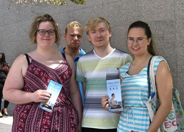 多伦多大学的大学生克里斯·马金(Chris Margin,右二)和朋友一行四人正在路边观看大游行。他说:“我们听到了天国乐团演奏的非常动听的音乐,所以就赶快过来观看大游行。法轮大法很好,因为修炼它会让人达到身心健康。这么好的功法在中国不应该被中共迫害,我支持你们的反迫害。”