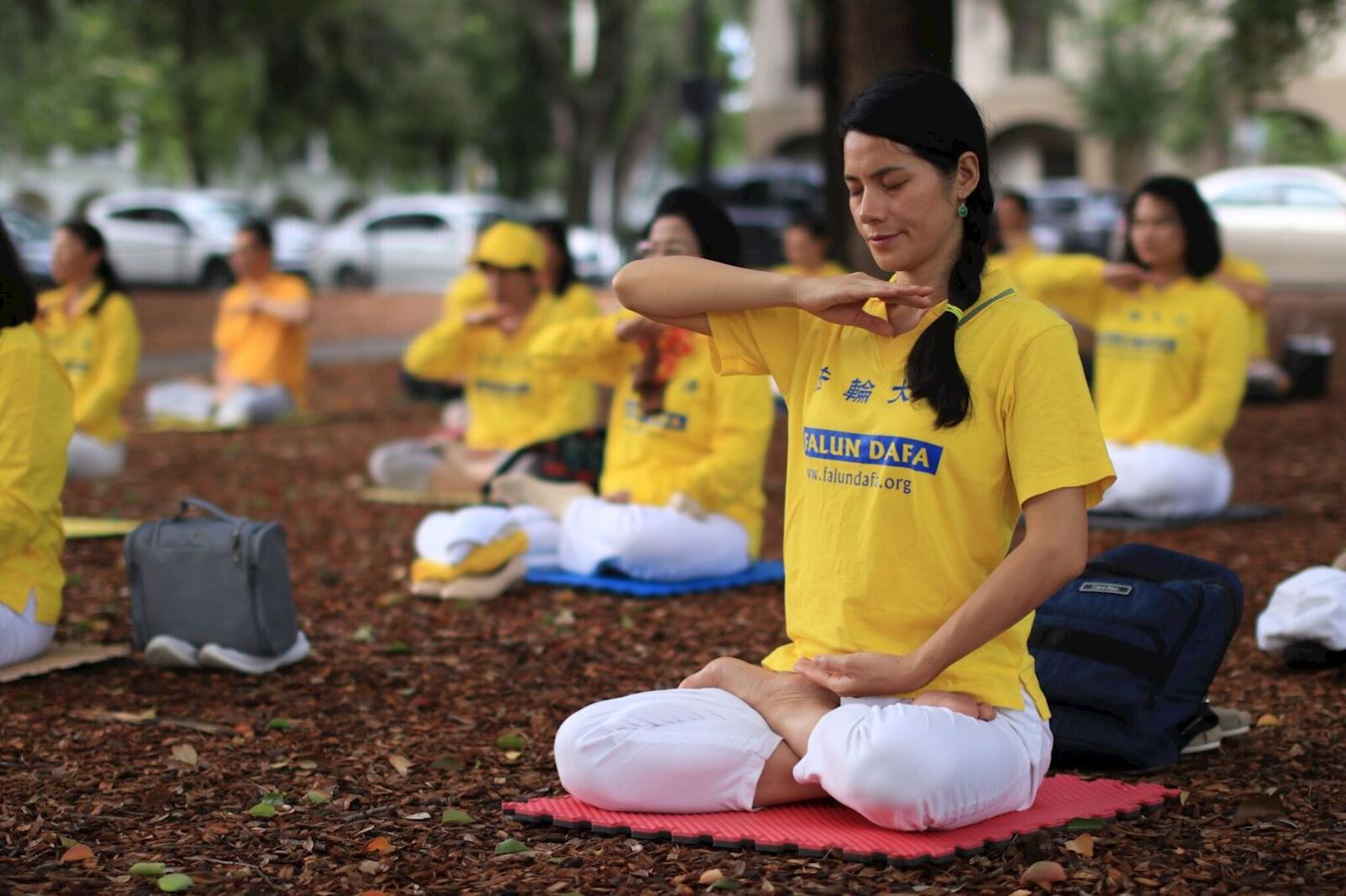 在烛光悼念之前,佛州法轮功学员进行了炼功和讲真相活动,安详的炼功场面和优雅整齐的动作,吸引许多来往公园的民众驻足关注,了解什么是法轮功和中共对法轮功的迫害及活摘法轮功学员器官的真相。