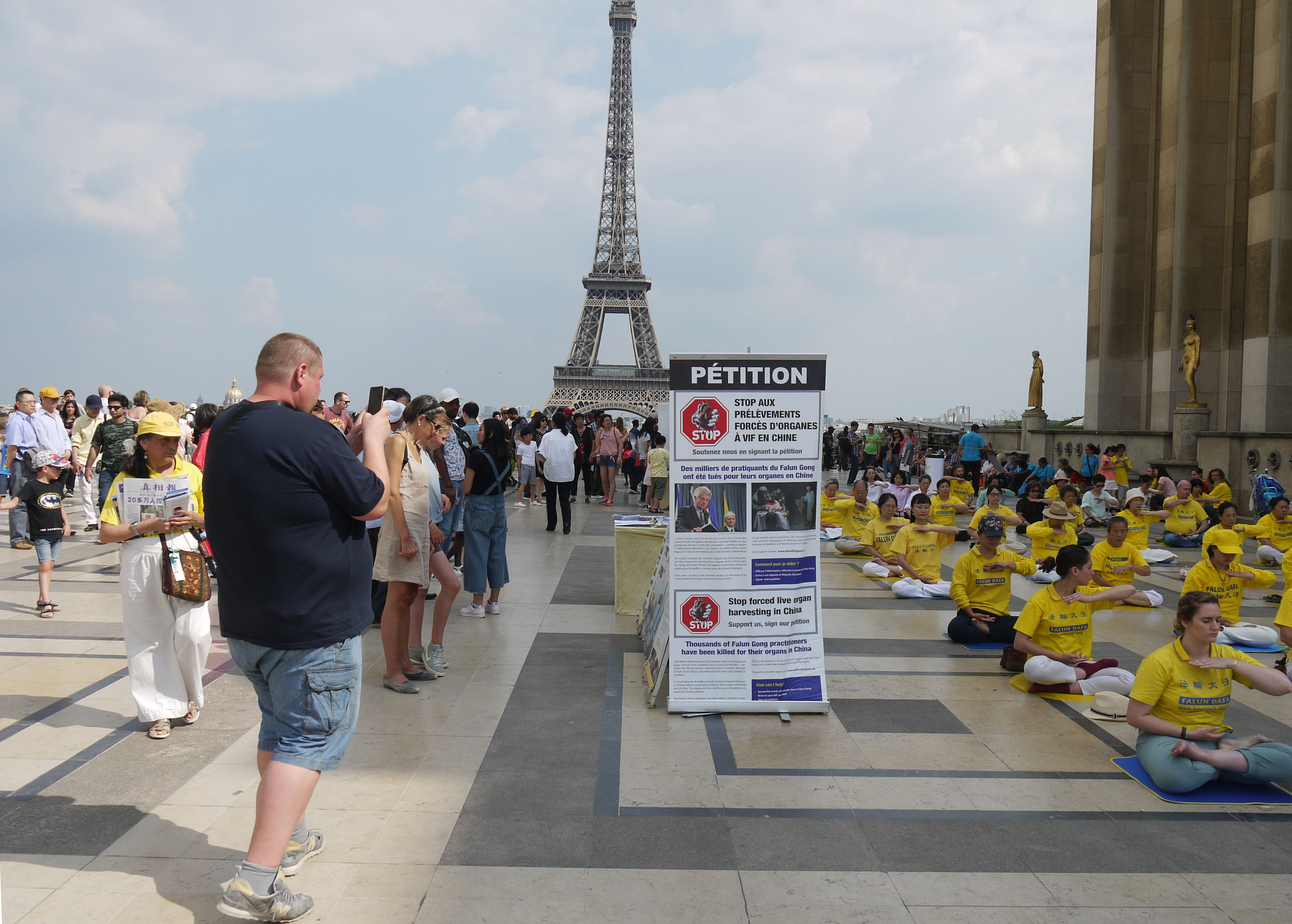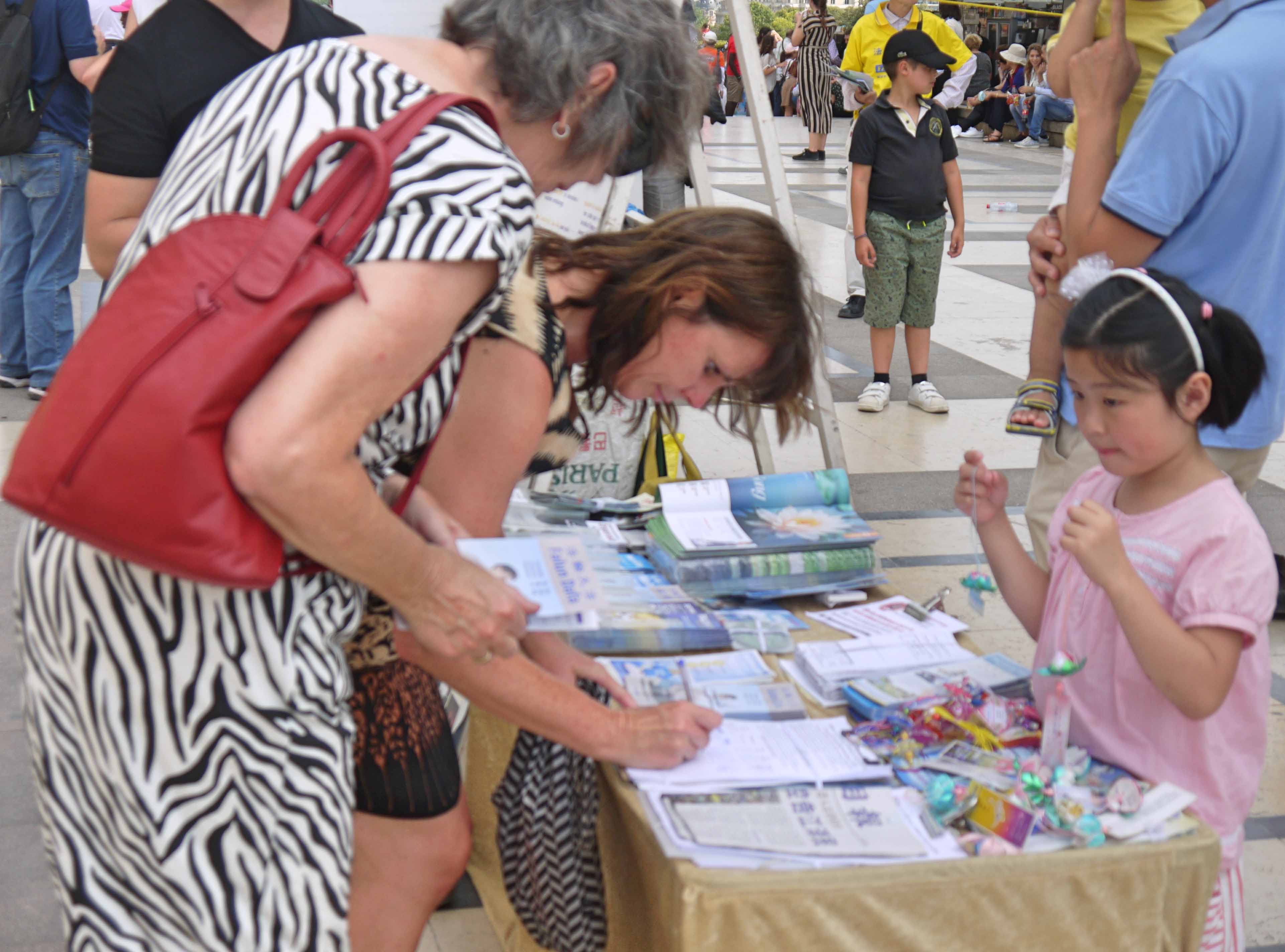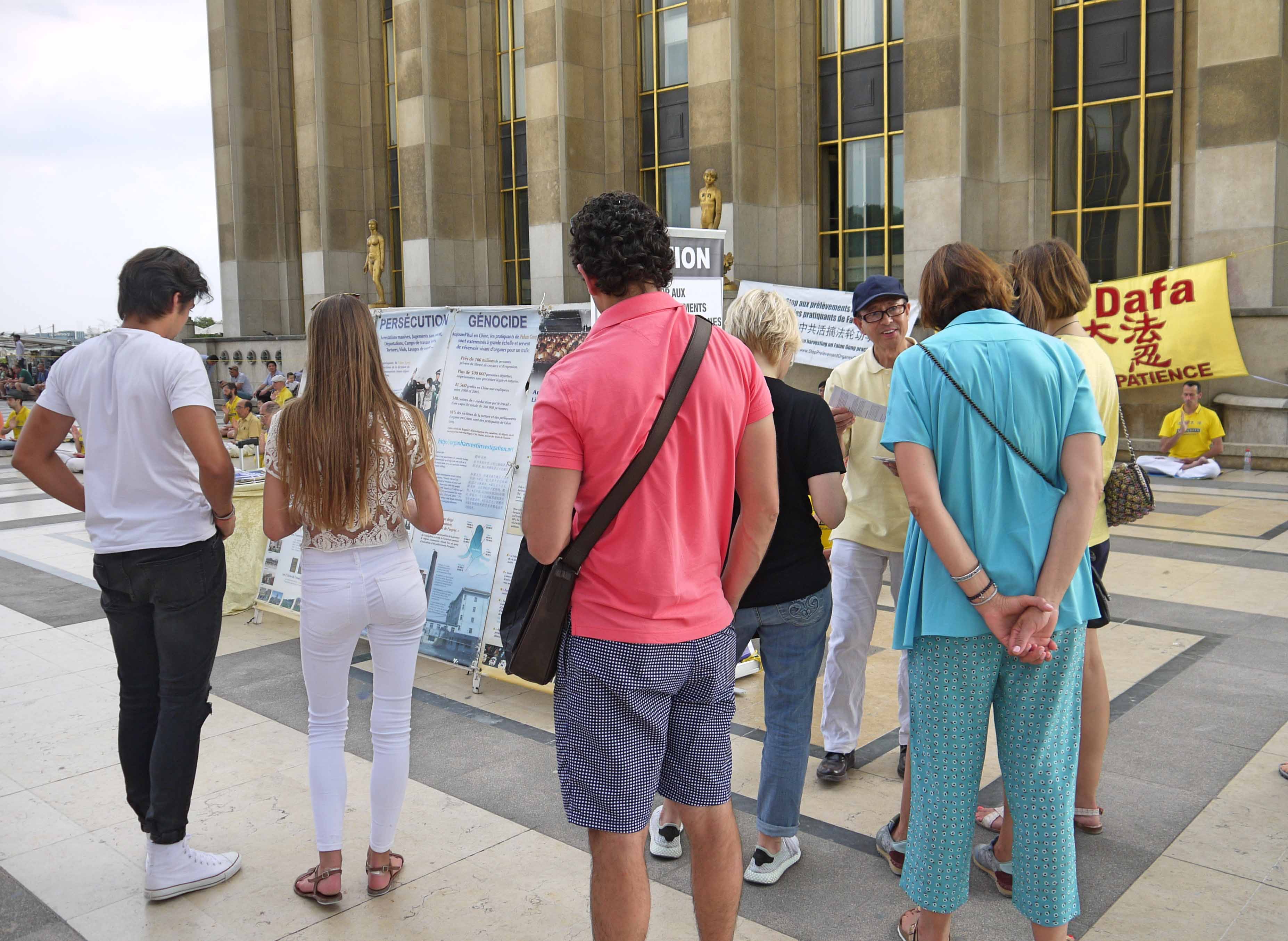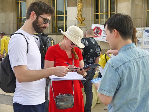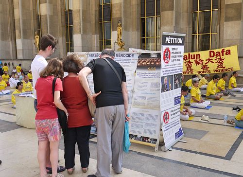 当天下午,在人权广场上,来自世界各地的游人和法国民众络绎不绝。他们或观看法轮功学员的功法演示,或阅读真相展板,或与法轮功学员交谈,了解真相。人们被宁静、祥和的法轮功功法吸引,被中共残酷的迫害震惊,他们不理解,为什么信仰真善忍会遭到迫害。人们纷纷在制止迫害征签表上签名。