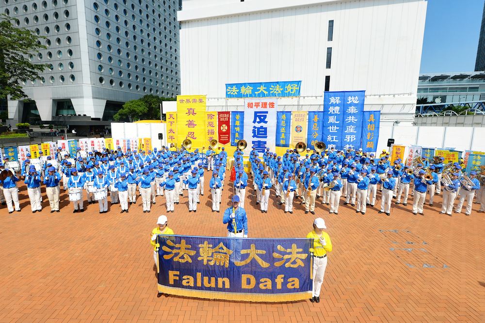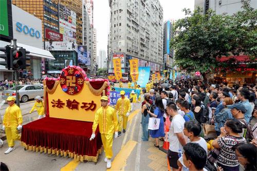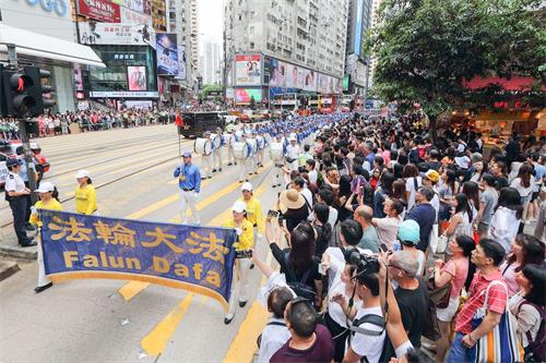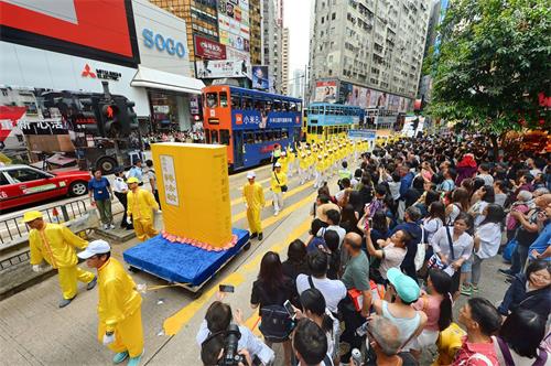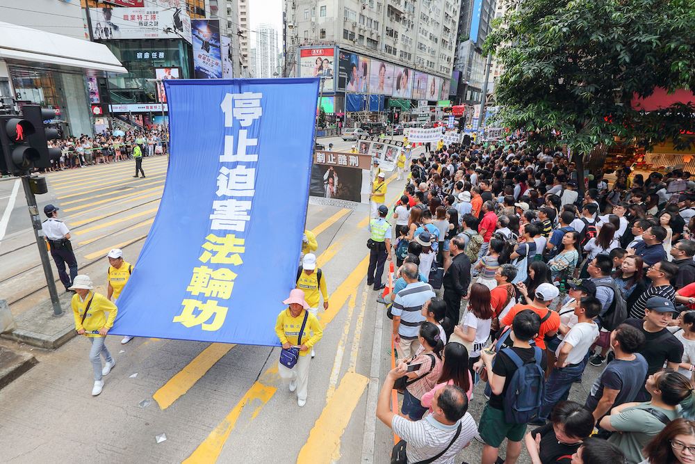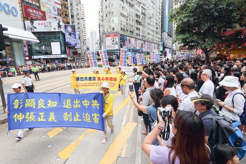 集会结束后,下午二时在香港警察的开路下,约一千一百多人的游行队伍以法轮大法天国乐团为前导,从北角英皇道游乐场起步,井然有序的队伍震撼许多路旁游客,有陆客惊见“法办江泽民”横幅,表示支持法轮功争取信仰自由,也有游客直呼“向善是很好的,中共应该停止迫害”。约在傍晚六时队伍抵达中联办,结束一天的活动。