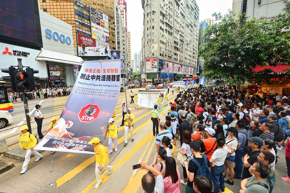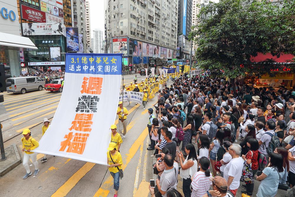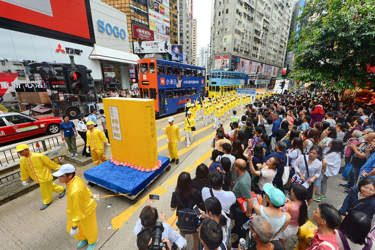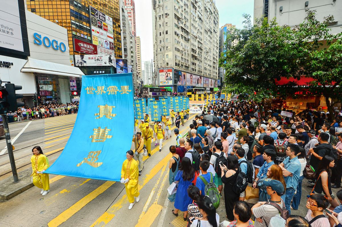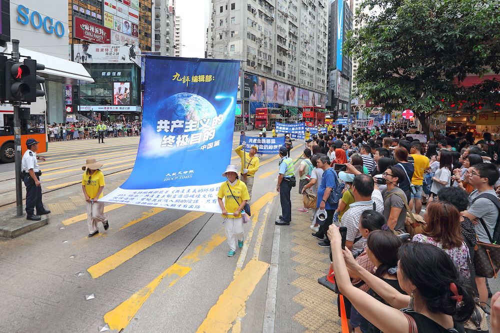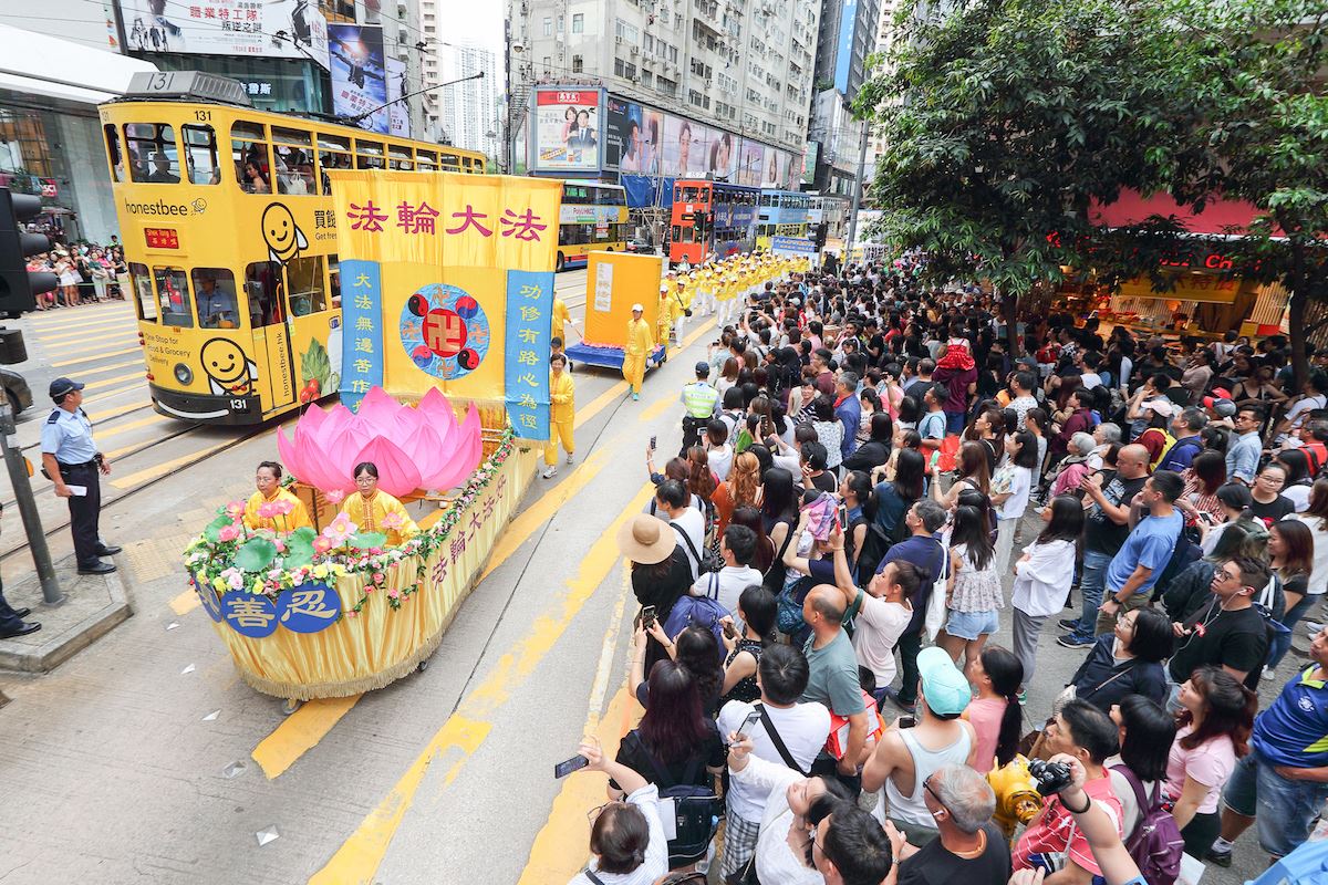 上午集会结束后,约一千人的游行队伍下午二时从北角英皇道游乐场起步,游行至终点中联办。游行队伍中大小横幅展示中共迫害法轮功的真相,震撼许多大陆游客。各式横幅幡旗有讲述中共迫害法轮功的真相,有弘扬法轮大法真善忍的美好,也有呼吁法办元凶、解体中共,共产主义的终极目的——毁灭人类等揭示共产主义祸害人类的内容,同时指出“回归传统 人类才有出路”。