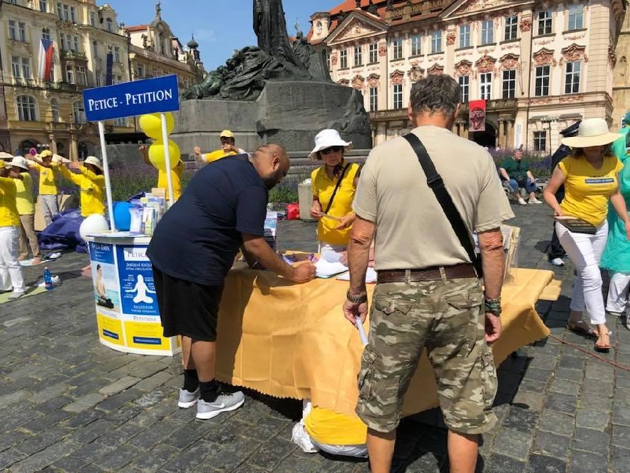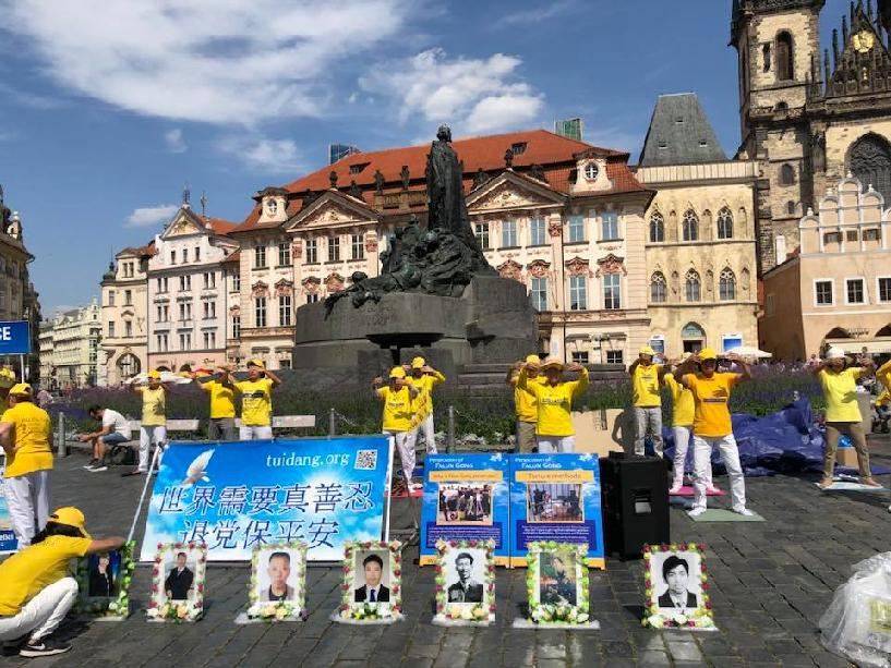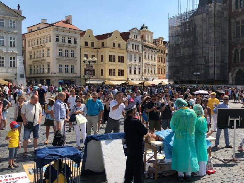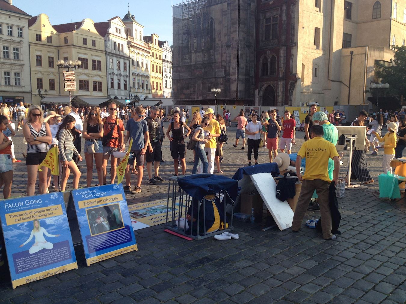 法轮功学员在老城广场举行纪念“7.20反迫害”十九周年集会,并向过往游人洪法讲真相。法轮功学员派发多种文字的真相资料,摆放展板和受害者的照片。模拟活摘法轮功学员器官的手术台,演示中共警察将法轮功学员当作“囚徒”,关在一个小笼子里进行酷刑折磨。让来自世界许多地方的游人了解法轮功学员被迫害,和被强制摘取器官的事实真相,很多人感到特别震惊,并在请愿书上签字表示支持法轮功反迫害,呼吁中共尽快结束对法轮功长达十九年的残酷迫害。