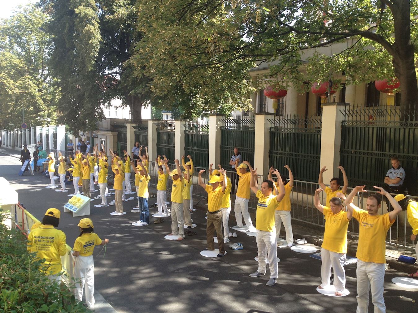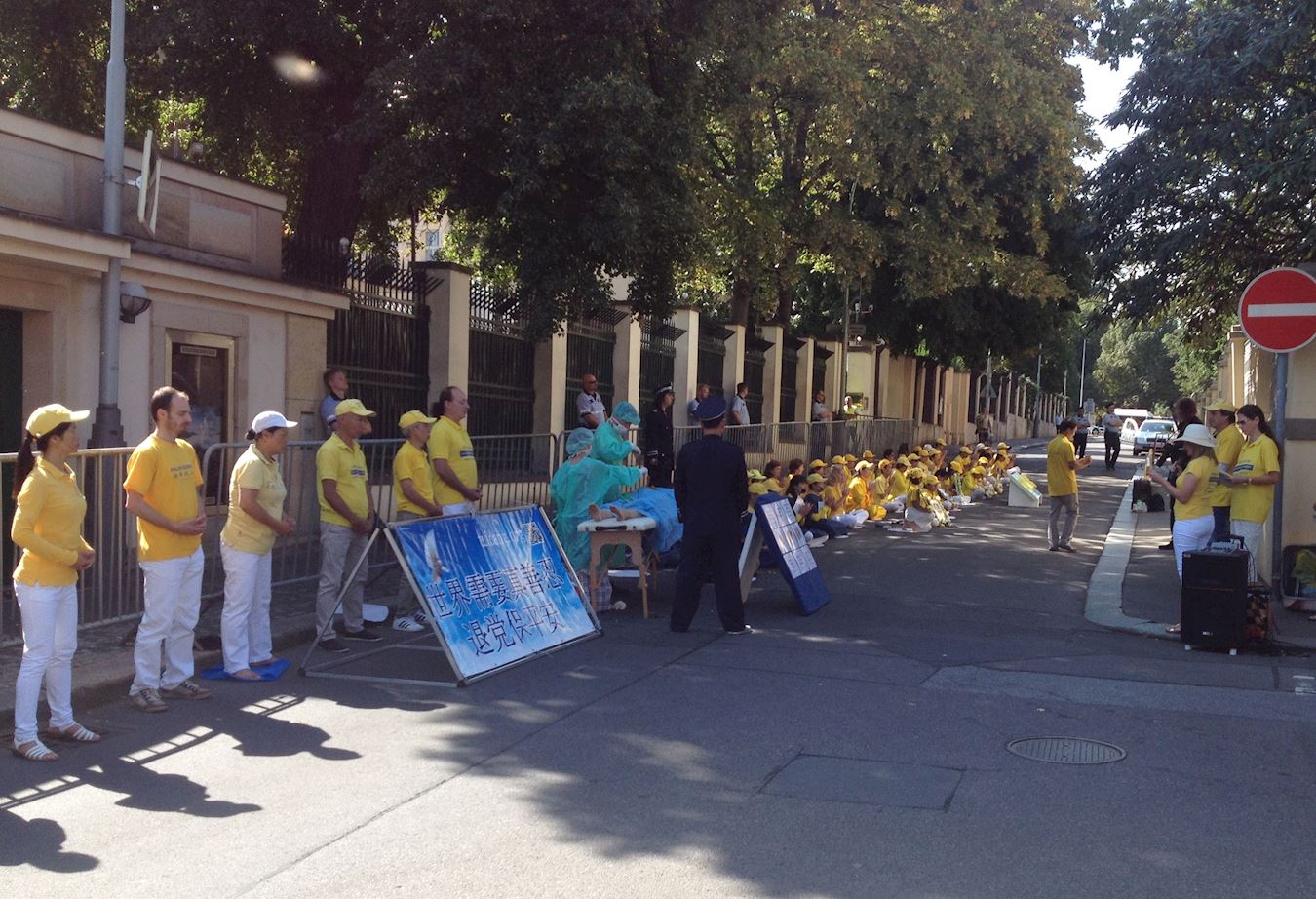 法轮功学员还来到中国驻布拉格大使馆前举行抗议活动。捷克法轮功学会负责人宣读了致中国大使的公开信,谴责中共的迫害,强烈要求释放所有被监禁的法轮功学员,并结束强摘器官的做法。信中强调,“全世界都看到了,这种迫害行为被认为是可耻的,与民主社会的原则是相抵触的。一要结束这种耻辱,使中国得到其他发达民主国家的尊重,中国就必须制止对法轮功的这场迫害。”