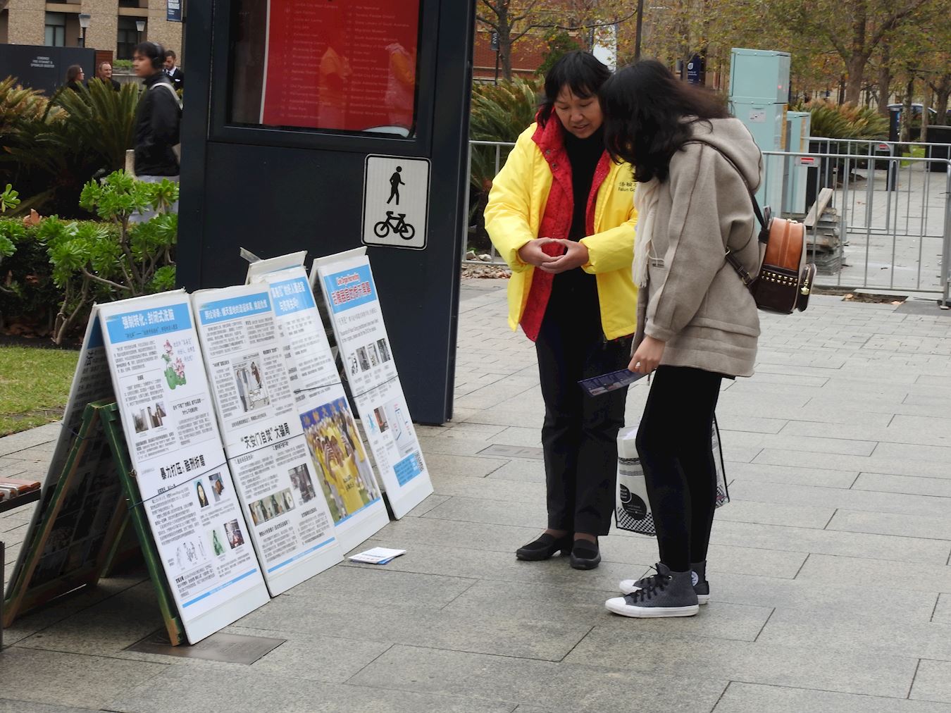 排列在阿德莱德大学正门外的展板吸引了一些中国学生停住脚步,主动来听学员给他们讲法轮大法的美好、天安门自焚是中共制造的骗局、迫害元凶江泽民在全球范围(包括中国大陆)被起诉、有三亿多人退出中共相关组织等真相。