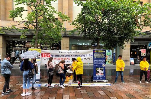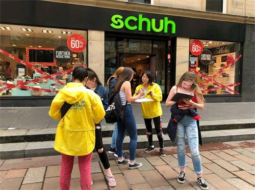 ![]() 图1~3:苏格兰各地法轮功学员聚集在格拉斯哥市中心举办反迫害活动 |