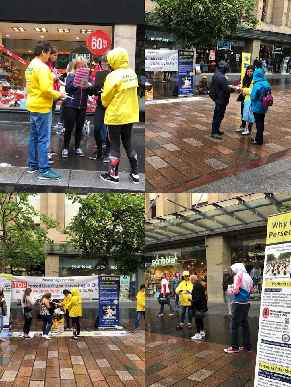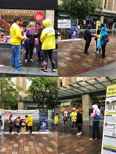当天虽然下着小雨,但是仍有很多民众冒雨驻足,停下来耐心地聆听学员讲述真相,大部份人感到震惊,并表示支持并在请愿书上签字,支持法轮功反迫害,呼吁尽快害结束镇压法轮功