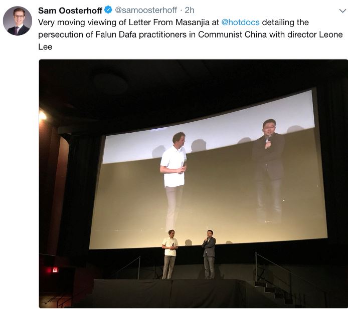 【明慧网二零一八年七月二十八日】(明慧记者章韵综合报道)正值法轮功学员反迫害十九周年之际,加拿大多伦多的Hot Docs Ted Rogers剧院在二零一八年七月二十一日至二十六日公映了揭露中共劳教所里对法轮功学员惨无人道迫害的纪录片——《求救信》(Letter From Masanjia)。这是反映法轮功学员遭受迫害的纪录片第一次在剧院里进行大规模的院线发行,多伦多是全球第一站。